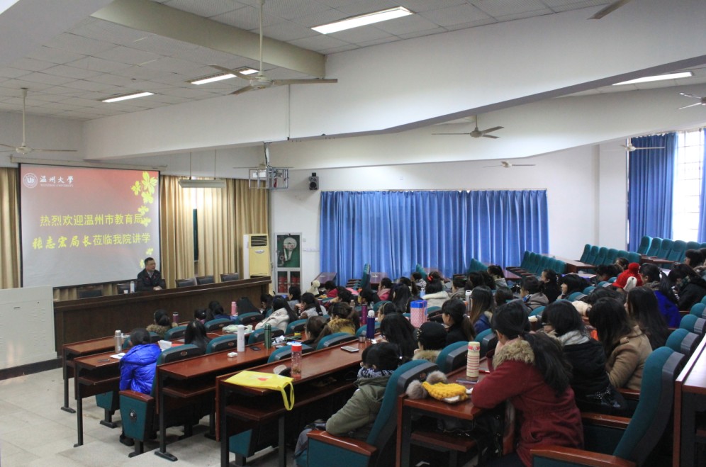 张副局长的到来受到同学们的热烈欢迎,他首先介绍了温州市教育现状,详细讲解了学前教育发展状况。指出:温州教育的教师和学生人数,是省内最高,其中学前教育中民办幼儿园占了幼儿园总数的92.7%;学前幼儿有32万之多,对幼儿教师的需求比较大。但是我市学前教育问题也十分明显,存在办园条件差、民办幼儿园过多、偏远地区师资匮乏、部分幼儿园安保落后等问题。张副局长同时也强调,为了提升我市学前教育发展水平,温州将大力发展学前教育:普及学前——高中15年的教育时间,并制定了三年行动计划;增加学前教育投入;不断增加公办幼儿园的数量,同时努力将温州建设成为国家民办教育实验区;强化幼儿教师队伍建设;支持民办幼儿园发展;提高学前教育办学水平,为幼儿创设身心发展的自由空间。张局长还特别指出,为了提升幼儿教师队伍建设,教育局将进一步增加编制、提升待遇。张副局长对毕业班级的同学们也寄予厚望,他建议大家:怀有教育理想,学前教育是我们的事业而非职业;善于学习,不断学习,开阔视野,才能从容面对不断变化的社会;充满爱心,投身教育事业;勇于创新,突破常规,才能有属于自己的一片天地。