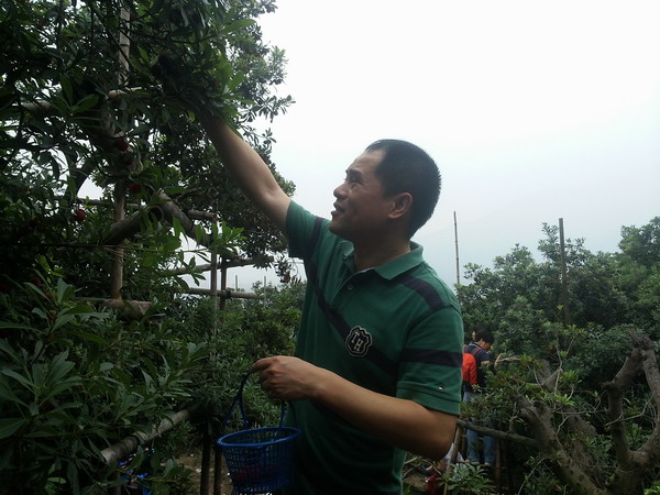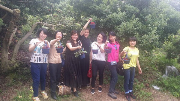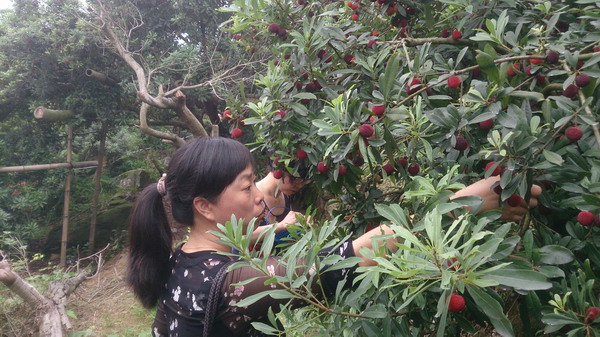 13:30,根据事先的安排,财神捕鱼 40多人分乘10几辆车子,组成了一支不小的车队,浩浩荡荡自驾来到茶山贾宅村。每人提着一个小篮子,开始上山摘杨梅。刚一上山,就见路边树上挂满了红彤彤的杨梅,直让人咽口水。经过一小段山路的攀登,来到指定地点,大家马上就忙活开了,纷纷开始边摘边吃,一边还不忘了用手机拍照留念。直到肚子吃饱,小篮子装满,出了一身汗,大家才依依不舍地下山回来。