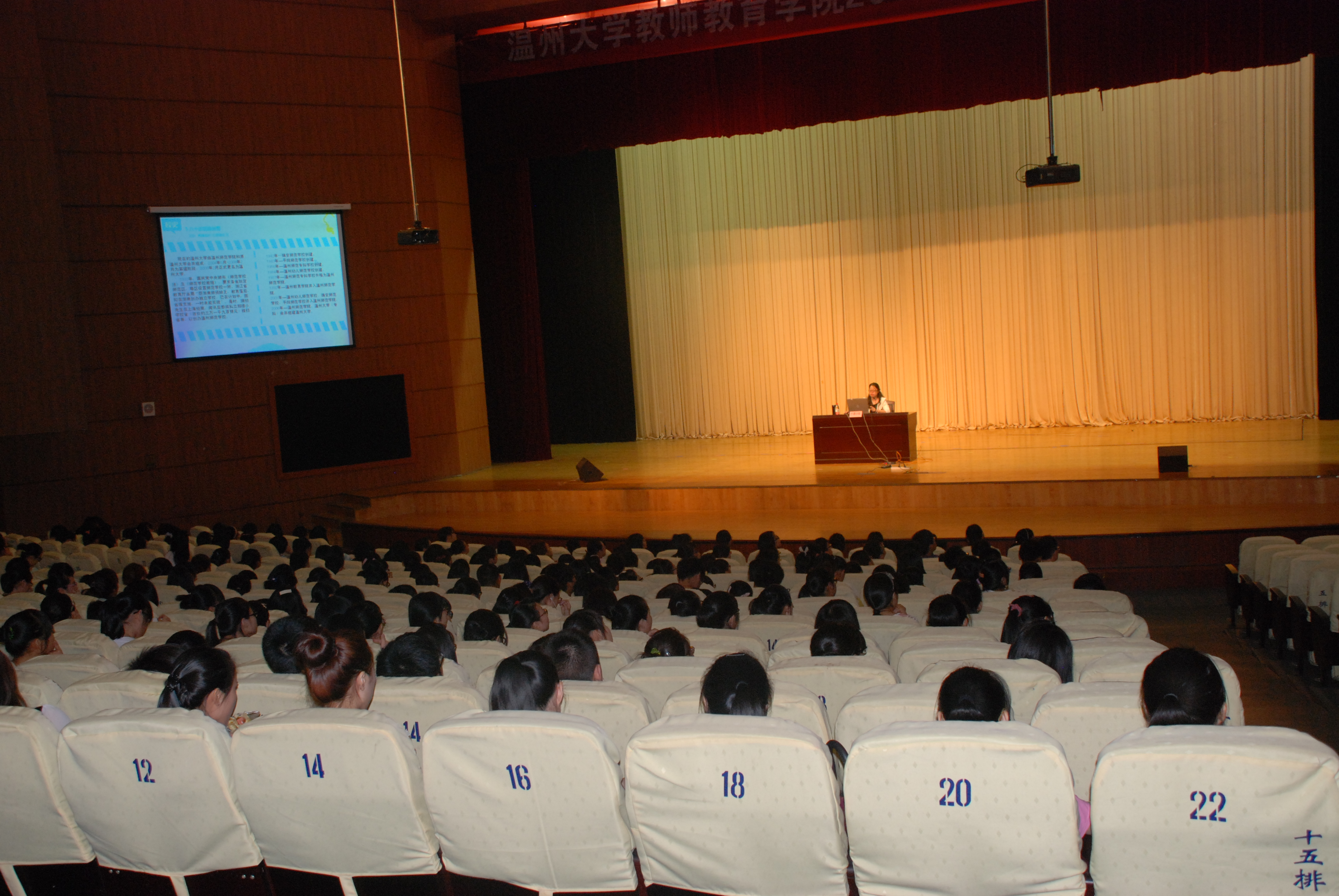 党总支副书记嵇小怡主讲的“我的大学第一课”在大学生活动中心演艺厅开讲,250来名刚刚踏入温大的本科新生及财神捕鱼