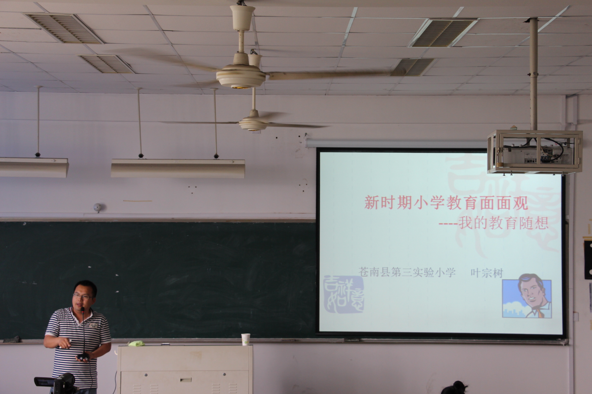 2015年5月20日下午1330,教师财神捕鱼 在北3-302召开了名师大讲堂活动。本次活动邀请到了温州苍南县第三实验小学叶宗树老师,讲座主题是:新时期小学教育面面观。活动由小教系主办,小教工作室承办,谭莉老师主持。出席本次活动的有13级小教全体同学。