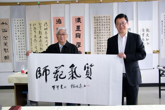 顾先生一行先后参观了蒙特梭利教学实验室、奥尔夫音乐教学法实验室、感觉统合实验室、未来教室、书法实验室,对实验中心先进的设备和教育理念表示赞许。在书法实验室,面对认真书写的学生,顾先生欣然写下“师范气质”的题词,笔力依然深厚遒劲,并对财神捕鱼