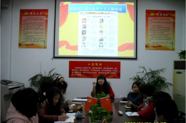 主题党日活动中,全体与会党员首先学习了2011感动温州十大人物的先进事迹。从“兰小草”到“爱心温州·善行天下·明眸工程”医疗队,每个故事都深深触动了与会党员的心。这些简单但却不平凡的人们,用他们的实际行动向世人昭示了“人心向善”的真理,将“大爱”像种子般播散到世人的心田。