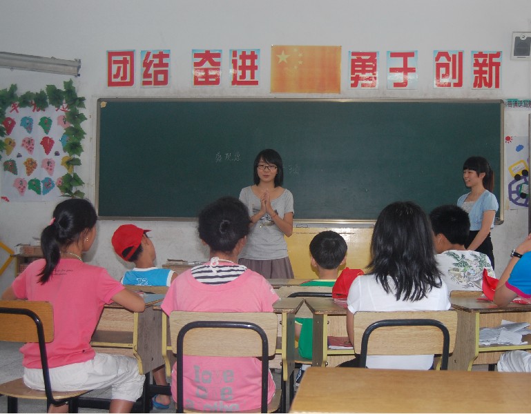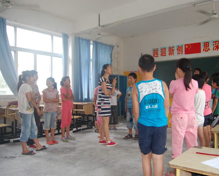 开展的暑期夏令营支教活动。早上八点整,各个年级和班级开始了他们的第一堂课,经过各位老师的组织和引导,同学们积极参与,气氛非常活跃,开班课进行得十分顺利。各位老师针对不同年级学生的各方面特征,安排了不同的教学内容。第一堂课主要以活动和班级交流为主,无论是普通话课、表演课、书法课还是国学课,都进行得有声有色,充分调动学生们的学习兴趣,为日后的教学开展奠定了良好的基础。在高年级的开班课——普通话课上,两位老师一起组织合作,做好自我介绍和基本的工作计划后,给班级的学生们分好组,并且让学生为自己的小组设计一张海报,方便了日后的普通话小组学习交流,并且大大增强了团体的凝聚力。之