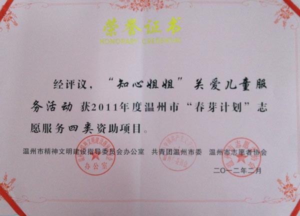 温州市“春芽计划”志愿服务小额资助活动旨在以小额资助扶持的方式推动全市志愿服务工作、加强各级志愿服务组织建设、加强与其他志愿服务组织交流合作,由温州市文明办、共青团温州市委、温州市志愿者协会、温州日报报业集团联合开展。2011年度共有来自全市各县(市、区)、各大高校志愿服务以及民间团队近100个志愿服务项目申报 “春芽计划”资助。