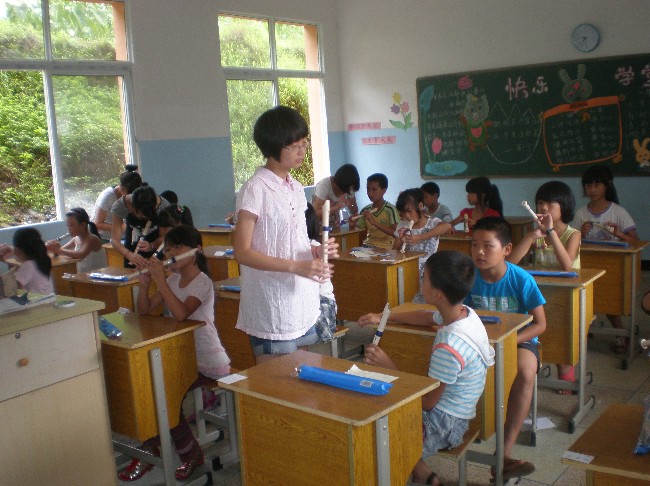 在趣味数学课中,实践队的同学们结合有奖问答的方式。不仅提高了学生们学习的积极性,还调动了课堂氛围,营造了良好的学习环境。在确保教学质量的情况下,避免了死板的教学方式,让学生们自主学习、自主思考。美术课与趣味数学不同的是美术课丰富了学生们的创造性。从画中我们可以看出学生们的快乐忧愁甚至是他们的梦想及对未来的憧憬。同样的音乐是心灵的传声,附带了情感内容。为了更好的实现教学目标,实践队员对学生们进行一对一辅导。在短短的一节课时间内,学生们掌握了竖笛的基础知识。并且学生们按照曲谱吹奏出一小段简单的歌曲。