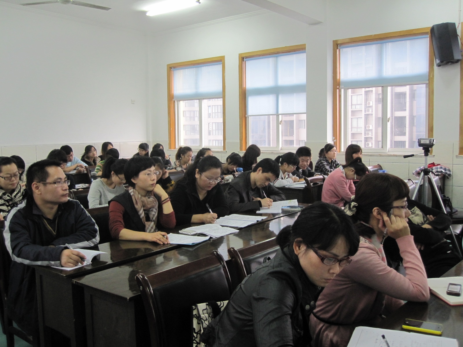 副院长孙芙蓉老师、教学科胡孙贵老师、高校指导老师、蒲鞋市小学卓东健校长、蒲鞋市小学名师办主任洪细苗老师、实习指导老师、全体实习生以及部分09级小教同学到场观摩。
