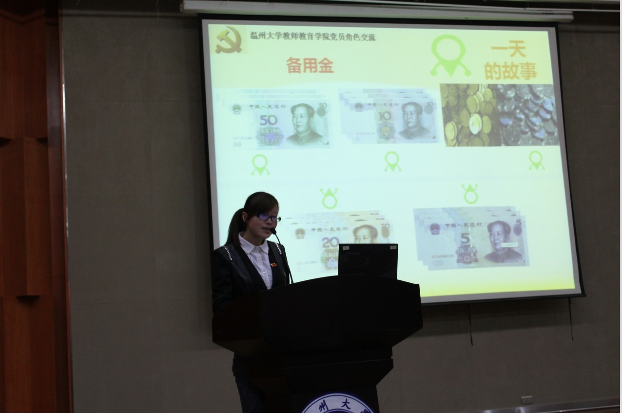 6位学生党员与大家分享了他们在寒假期间的角色体验。陈京京同学体验的是支教教师这一角色,她联系自己寒假参与广西支教志愿服务的体验经历,呼吁广大同学们关爱、关注贫困山区留守儿童,为支持我国农村教育事业贡献出自己的力量,积极参与到“大学生志愿服务西部计划”中来。徐玉华同学体验的是超市收银员工作,收银员工作的严谨性、规范性,使得这份职业充满了挑战,而同事之间的相互关心,又使这份职业体验充满了温暖。朱文婷同学体验的是财神捕鱼