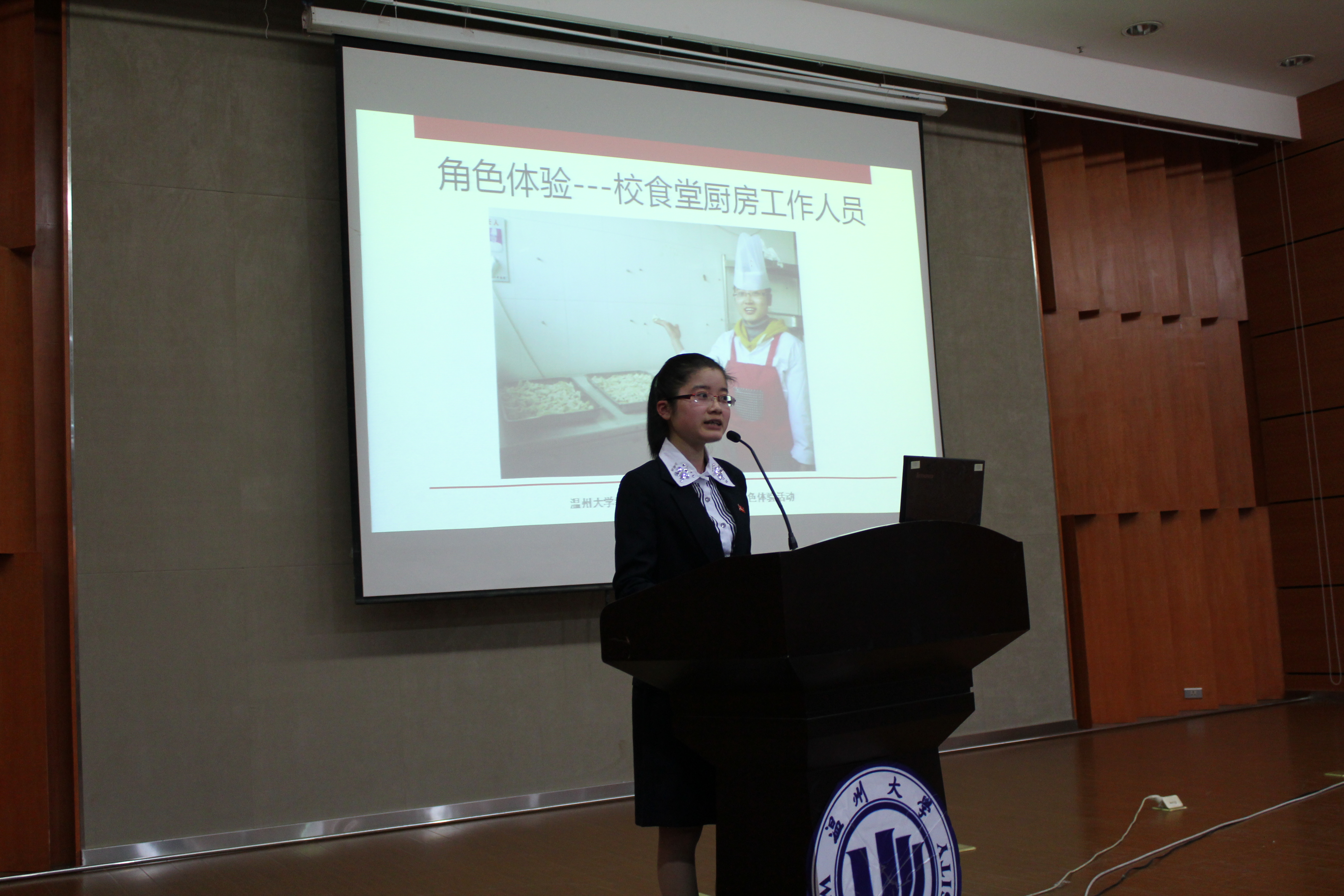 食堂工作人员这一角色,她回顾了这一周的艰辛与不易,她倡议同学们要珍惜人民群众的劳动成果,厉行节俭,拒绝浪费,参与到“光盘”行动中来。骆利锋同学体验了建筑工人的艰辛生活,建筑工人干着最累的活,拿着很少的工资,却用双手创造出了一幢又一幢雄伟的建筑。他们因为破旧的穿着、物质的贫乏,不被社会所重视。骆利锋同学以他的工友故事为例,号召大学生们尊重每一份职业。吴银选同学体验的是敬老院护工的角色,从她温柔细腻的声音当中,我们感受到了老年人的孤独与无奈,关爱父母、关爱老人就是关爱自己的未来。林敏敏同学体验的是家电售货员的工作,在她娓娓道来的讲述中,在场听众们了解了如何运用消费心理学做好推销,感受到只要你踏实、努力,三百六十行,行行能出状元。