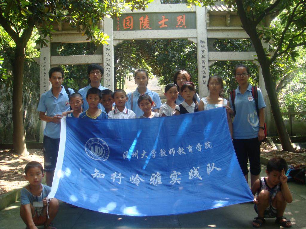 陵园建立在瑞安西山上,实践队队员和孩子们顶着烈日,不畏艰辛地从山脚一路往上爬。 进了大门,孩子们就被耸立在陵园正中的烈士纪念碑所吸引住。纪念碑高十几米,用花岗岩石砌成,碑体上刻着