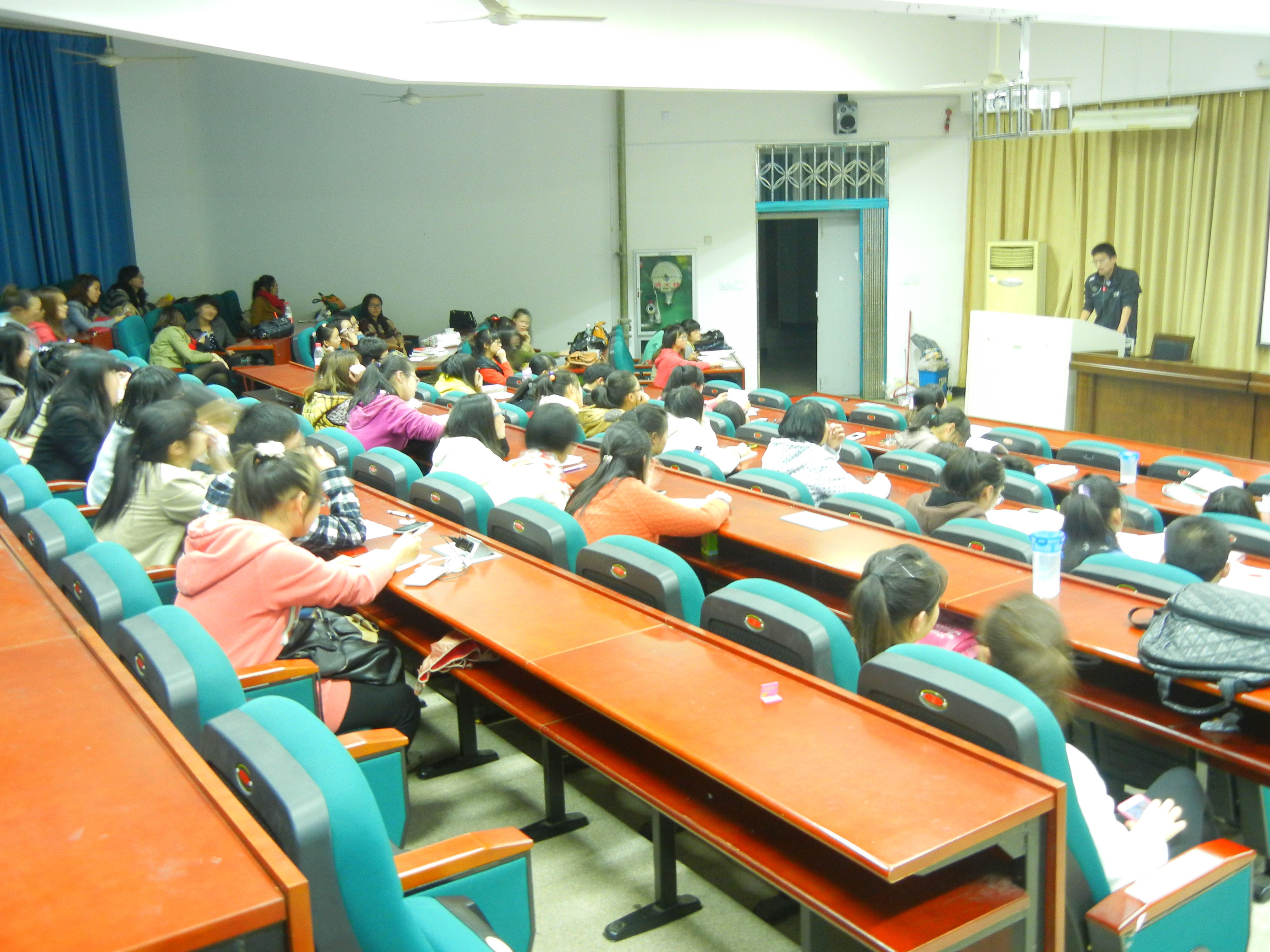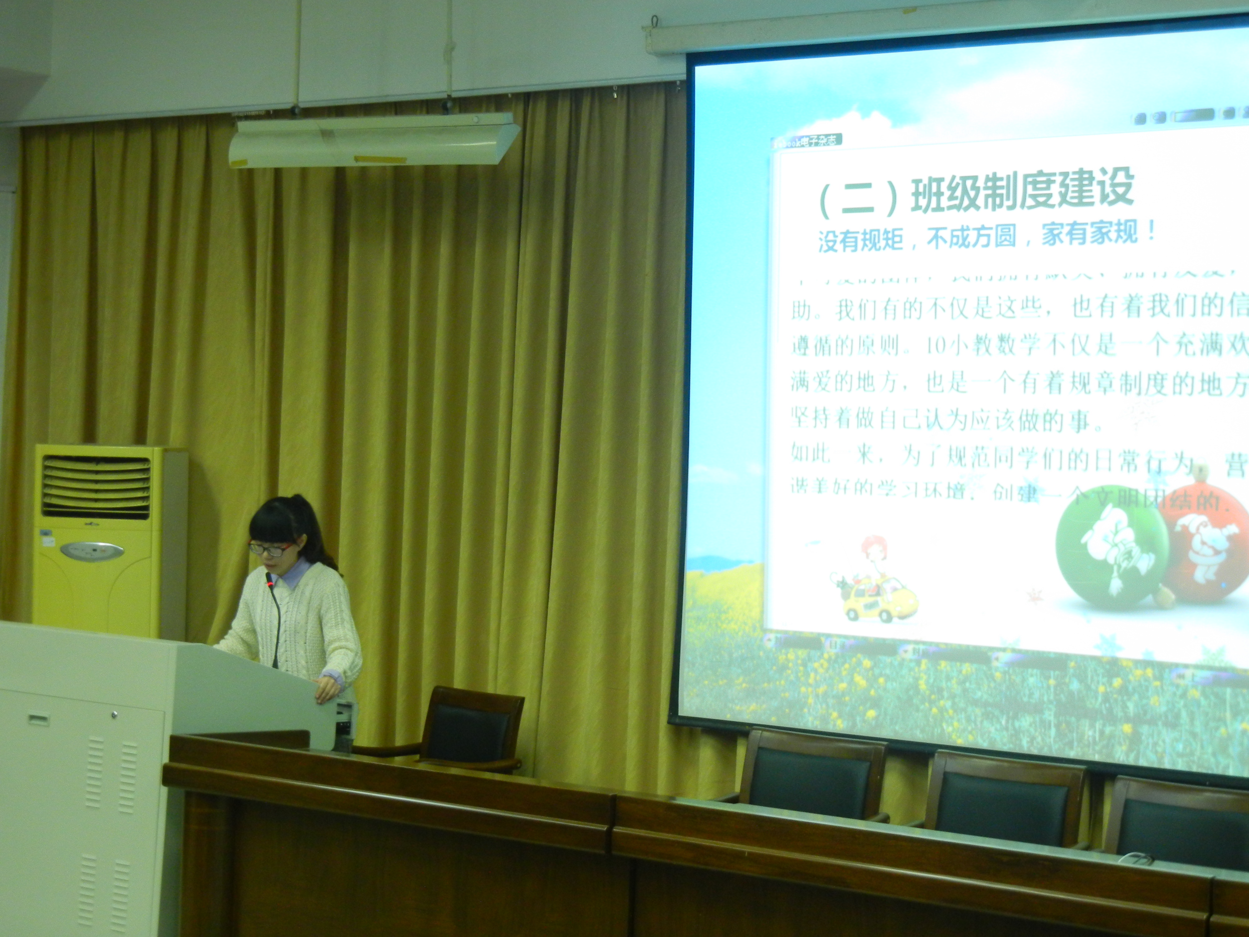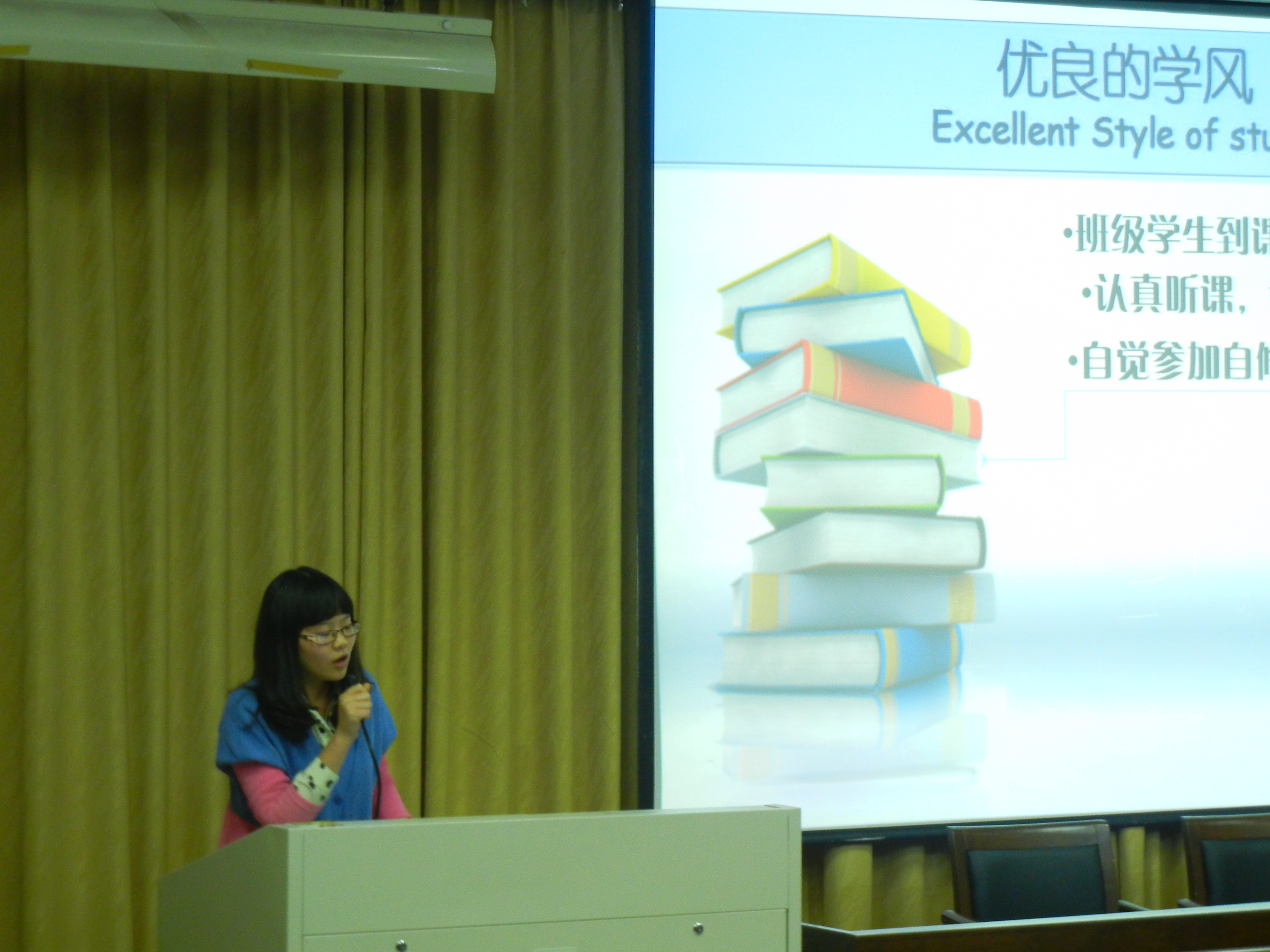 本次“优良学风班级”评比活动主要由PPT展示演说和班级互动两部分组成。本次活动各参与班级通过精心准备,结合PPT、电子书和视频短片展示介绍了班级过去一年在学风建设、考风建设、组织建设、党性思想等方面的特色做法、成功经验和丰硕成果。部分班级在各类学生组织中担任部长及以上级职务的同学占到班级同学的比例甚至超过90%。精心制作的PPT中展示了班级活动照片以及简要的描述,展现出班级精神风貌,体现了各班的优良学风。PPT中也展示了可喜的荣誉与成绩、对未来的美好蓝图等等,无处不洋溢着魅力四射的青春活力。精美的PPT展现以及班级精彩的互动,台下同学掌声雷动,相互呼应,展现了朝气蓬勃和团结向上的班级风貌。
