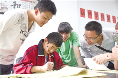志愿者教聋哑儿童写毛笔字。