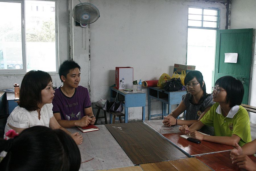 ,一方面来看望我们,另一方面看一下小学生的学习状态,检验一下这几天来我们教学的效果。杨书记看到我们队员在上美术课,孩子们在底下认真听讲的情景,她表示队员们在没有任何教学经验的前提下能够很好的组织教学,掌控课堂很不容易,很值得鼓励。在看完学生的上课状态后,我们就围坐在一起,讨论自己这几天来实践的感想,队长周赛君说:“培英财神捕鱼