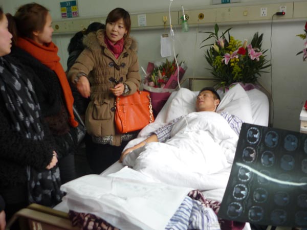 病房里,支部书记胡仲仲老师代表支部为勇士送上了祝福的鲜花和果篮。学生党员们纷纷关切地询问朱培培目前的伤势,希望他注意休息,早日把身体养好。学生党员们还就自己平时生活中遇到窃贼的事件及处理办法与朱培培做了交流。交谈中,朱培培同志告诫学生党员们,遇见行凶的歹徒不要逞能,一定要量力而行,生命是第一位的。