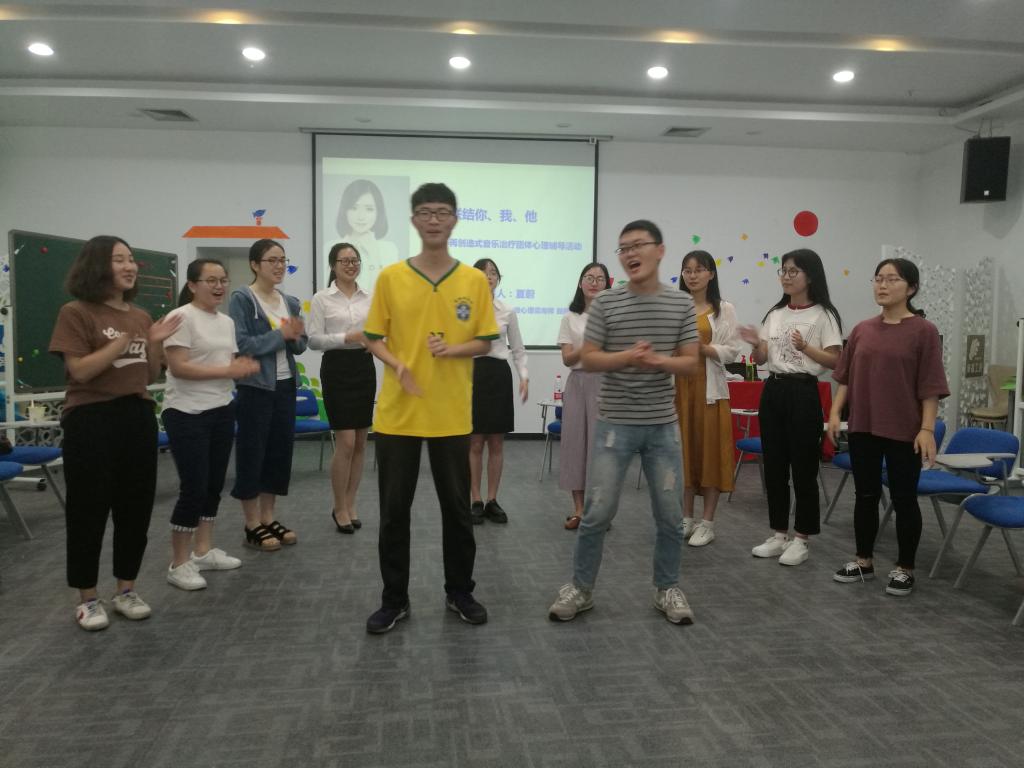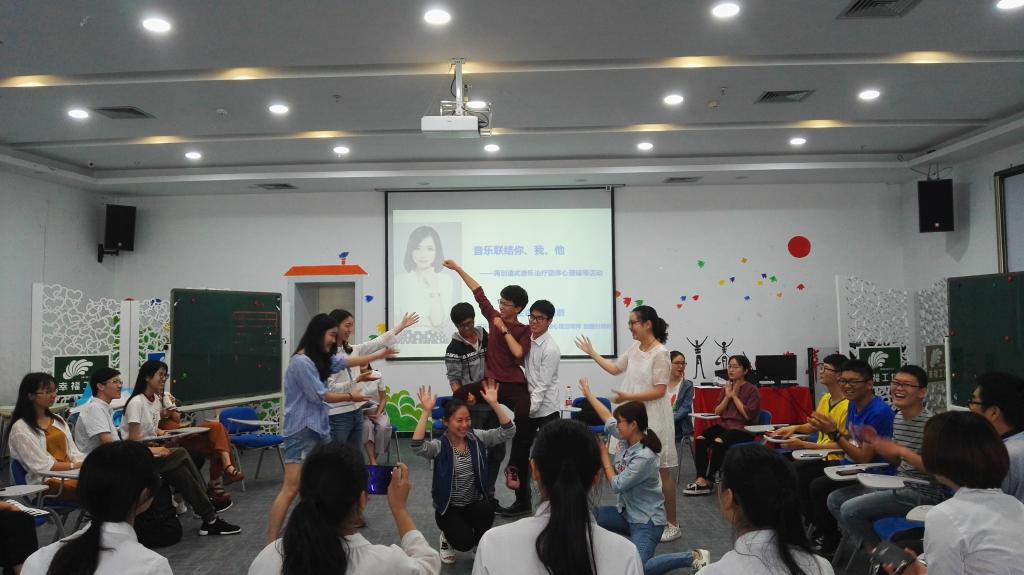 学生骨干开展再创造式音乐治疗团体辅导。在夏蔚老师的亲切引领下,同学们进行了小型音乐剧编排、歌曲创编等活动,用美妙的音乐联结你、我、他,极大地增强了团队凝聚力。最后夏蔚老师以一句“当语言失效的时候,请音乐来帮忙”,音乐的魅力是无止尽的。