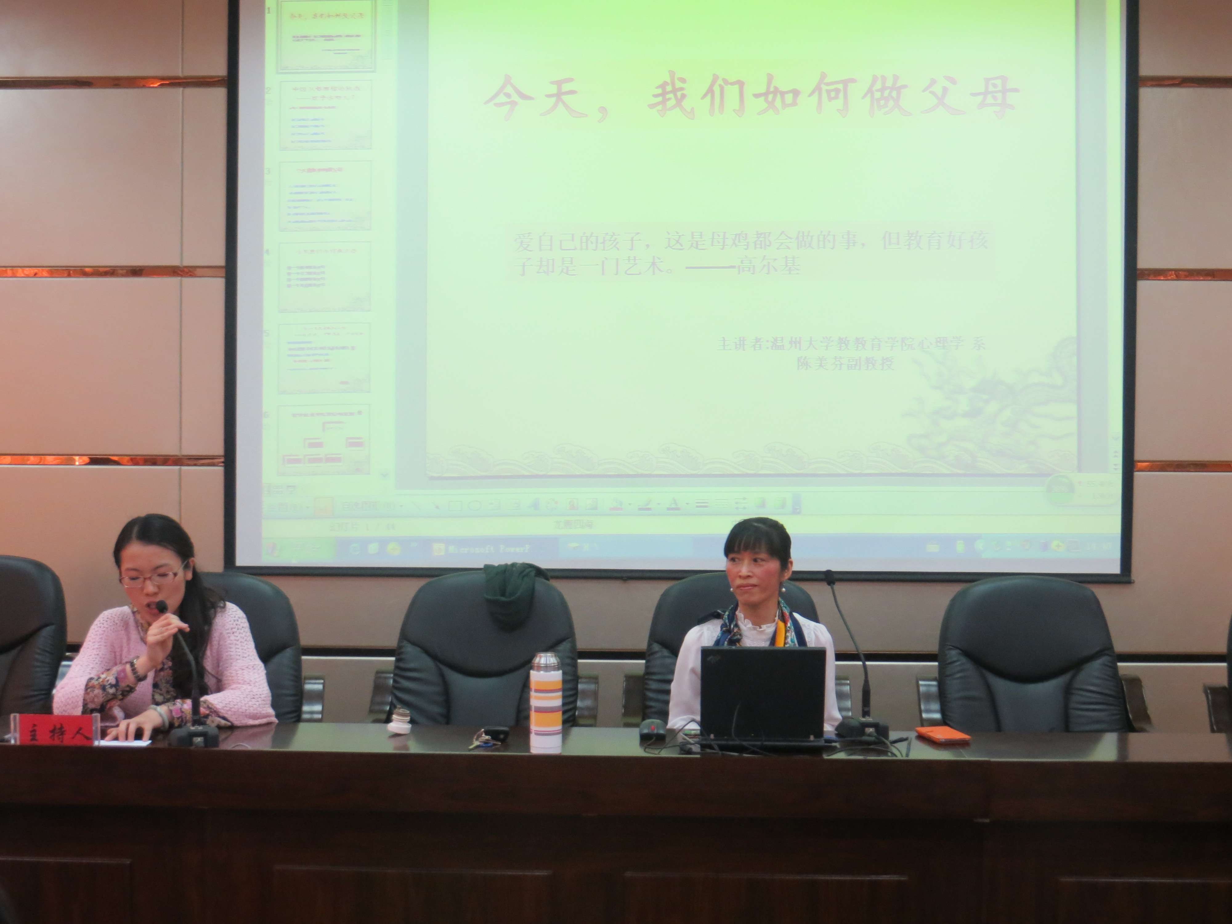 心理学系陈美芬老师前往苍南为家长们开展讲座。本次讲座的主题为“今天,我们如何当父母”,受到了家长们的热烈欢迎,整个会场座无虚席。陈美芬老师先是指出:妈妈高度是孩子成长的起点,爸爸的高度是孩子成长的方向,阐述了孩子成长中父母齐心协力的重要性。然后,直击困扰家长们的焦点问题“我的孩子去哪儿?”,并从心理学层面,剖析了家长们陷入了普遍集体性焦虑的成因,接着结合一个个鲜活的案例向家长们提出“做一个思考型的父母、学习型的父母、倾听型的父母、阳光型的父母”等具体建议。期间,陈美芬让家长们分享自己教育子女过程中的诸多感悟,引起了家长们强烈的共鸣,会场上不时爆发出热烈的掌声。