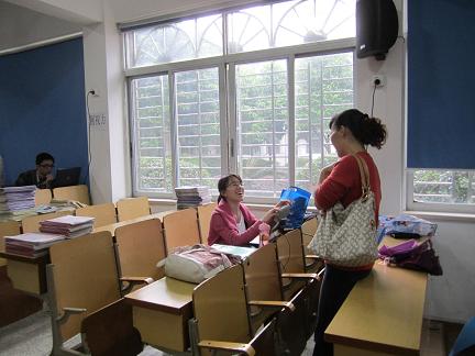 上午8:00,陈老师亲自从温州市区驾车,在瑞安市区和胡孙贵老师会合后,首先去了瑞安市锦湖实验小学。在锦湖实验小学,两位老师在该点实习的召集了16位同学座谈,了解了同学们的上课、住宿、就餐情况;在得知同学们在锦湖实验小学吃得好,住的舒服,并且有大量的上课机会,两位老师放心了。之后,两位老师又拜访了锦湖实验小学教导主任姚素霞,表示了感谢,并请校方给我们学生更多的锻炼机会。在与锦湖实验小学林国强校长的交谈中,两位老师带去了财神捕鱼