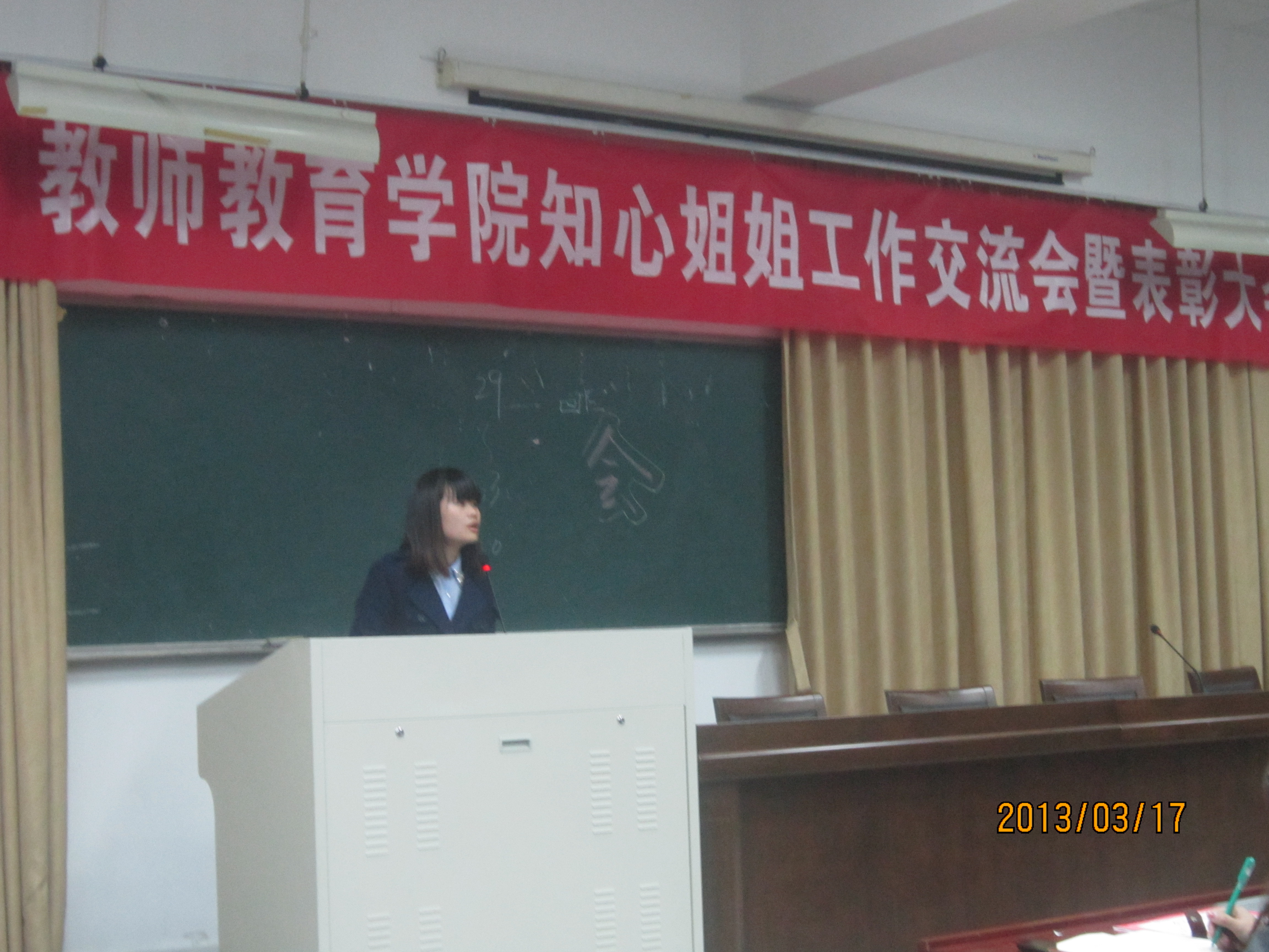 接着,由吴冬冬老师给获得知心姐姐工作积极分子的同学以及获得知心姐姐师范技能大赛的一二名颁奖,紧接着由虞静婕等人作为代表发表获奖感言。她们表示:知心姐姐的工作历程带给了她们很多收获,她们既认识到了自身的不足也发现了自己身上的长处。
