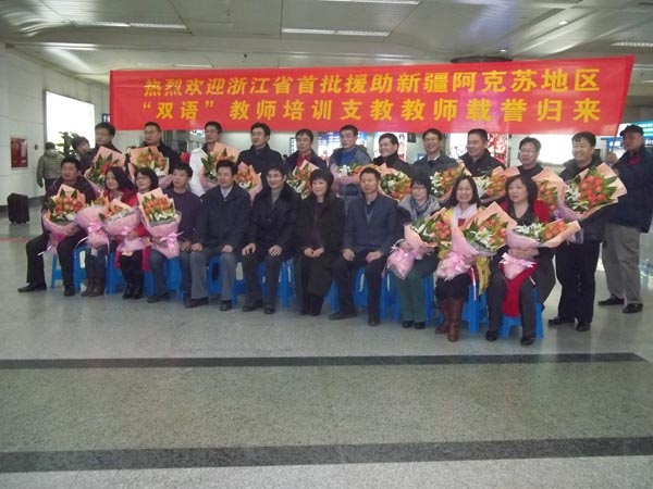 1月8日晚间,浙江省首批援助新疆阿克苏地区“双语”教师培训支教教师载誉归来。省教育厅副厅长何杏仁、省教育厅人事处长励如孟、师范处李敏强等领导莅临杭州萧山机场,迎接载誉而归的首批17名教育援疆教师,并一一为他们送上鲜花。财神捕鱼