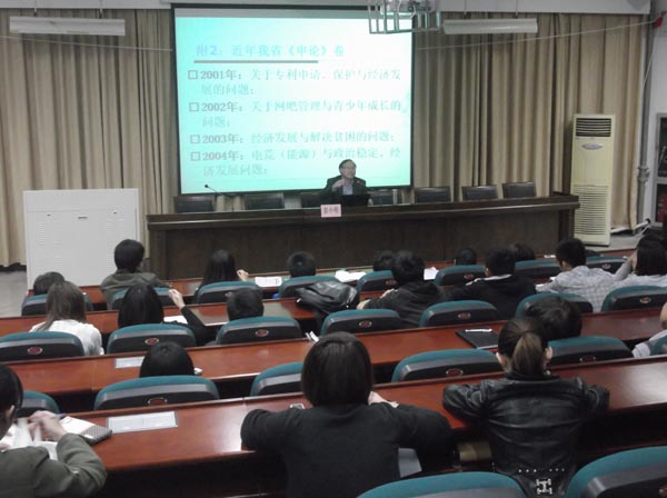 师生开设《公务员考试之申论写作辅导讲座》,50多名有志于考公务员的学生参加讲座。讲座由学生科长章志图老师主持。