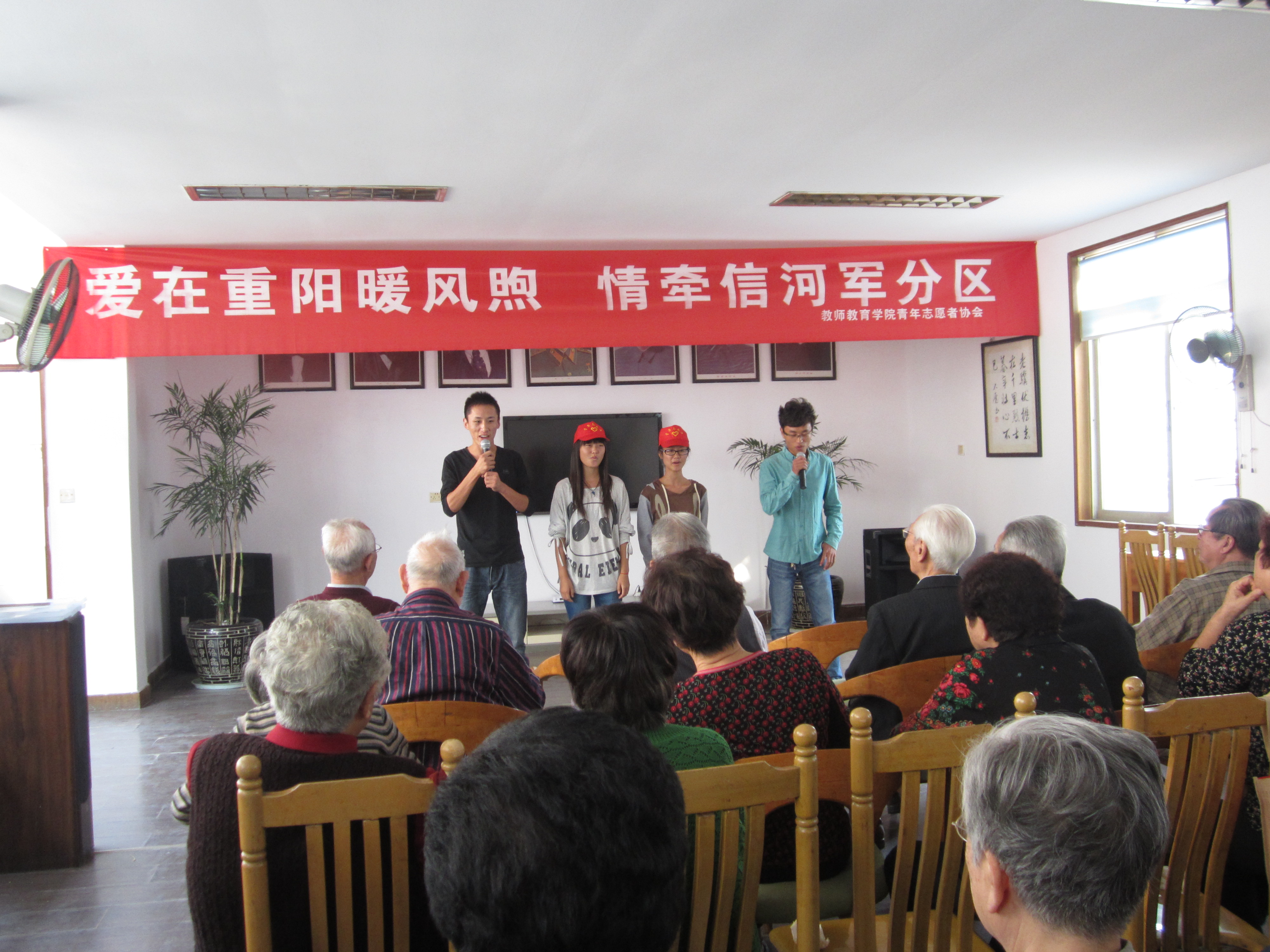协办的重阳敬老志愿活动,在位于信河街的军分区展开。下午2点,志愿者们在军分区内忙碌地布置着场地,以期呈现一个完美的演出场地。50分钟之后,场地布置告一段落,重阳节慰问演出正式开始。首先是由军分区负责人杨叔叔带来的一段讲话,表示了对远道而来的学子们的感谢以及对接下来精彩节目的期待。紧接着,来自教师财神捕鱼