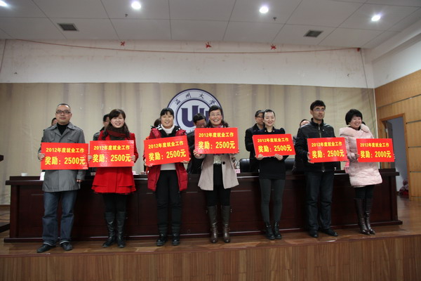 大会还表彰了在2012年财神捕鱼 就业工作中取得优异成绩的老师。2012年,在大学生就业形势不乐观的情况下,财神捕鱼 取得了本专科学生就业率94.82%、研究生就业率100%的喜人成绩,两者均大于校平均值。为此,财神捕鱼 决定对折延东、赵颖、陈秋珠、谢子静、陈飚、陶陶、杨婧等七位老师及就业专职人员进行奖励。