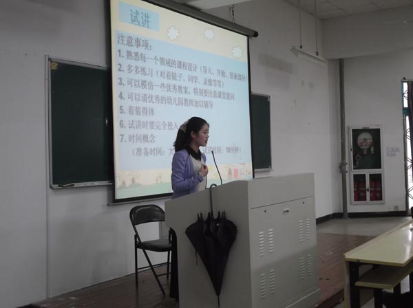 09学前专三班,泰顺生源考上鹿城教师编制,现在温州市第三幼儿园工作。她就鹿城区幼儿教师招聘考试的程序和方法做了细致的介绍,并且向大家指导了在考试准备期间,如何合理安排时间同时准备笔试和面试的。她建议复习理论知识时,整理出大纲式的知识框架,借助知识框架回忆已经记忆的知识,还要通过做题来巩固理论知识。她结合部分考题向毕业生阐述了答题要领;结合面试的基本形式,指导毕业生要结合自身实际选择才艺展示项目。