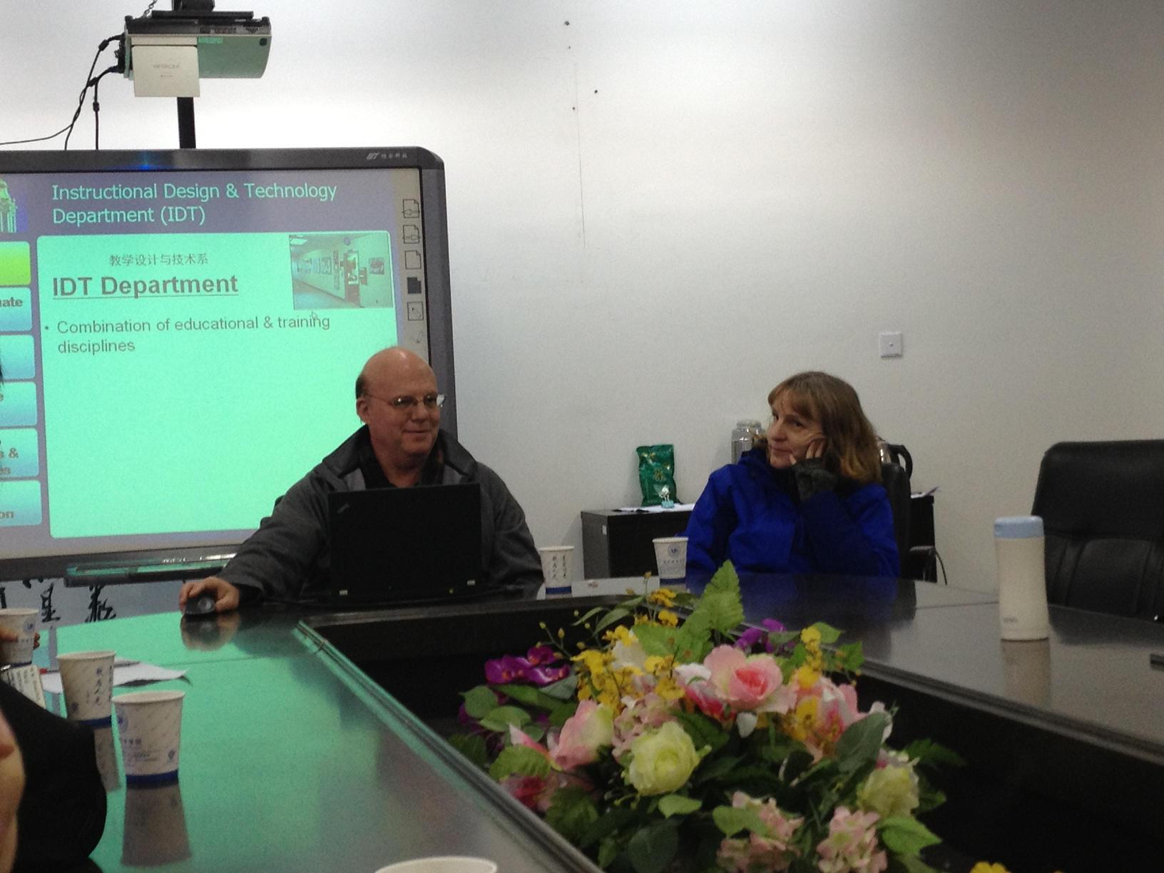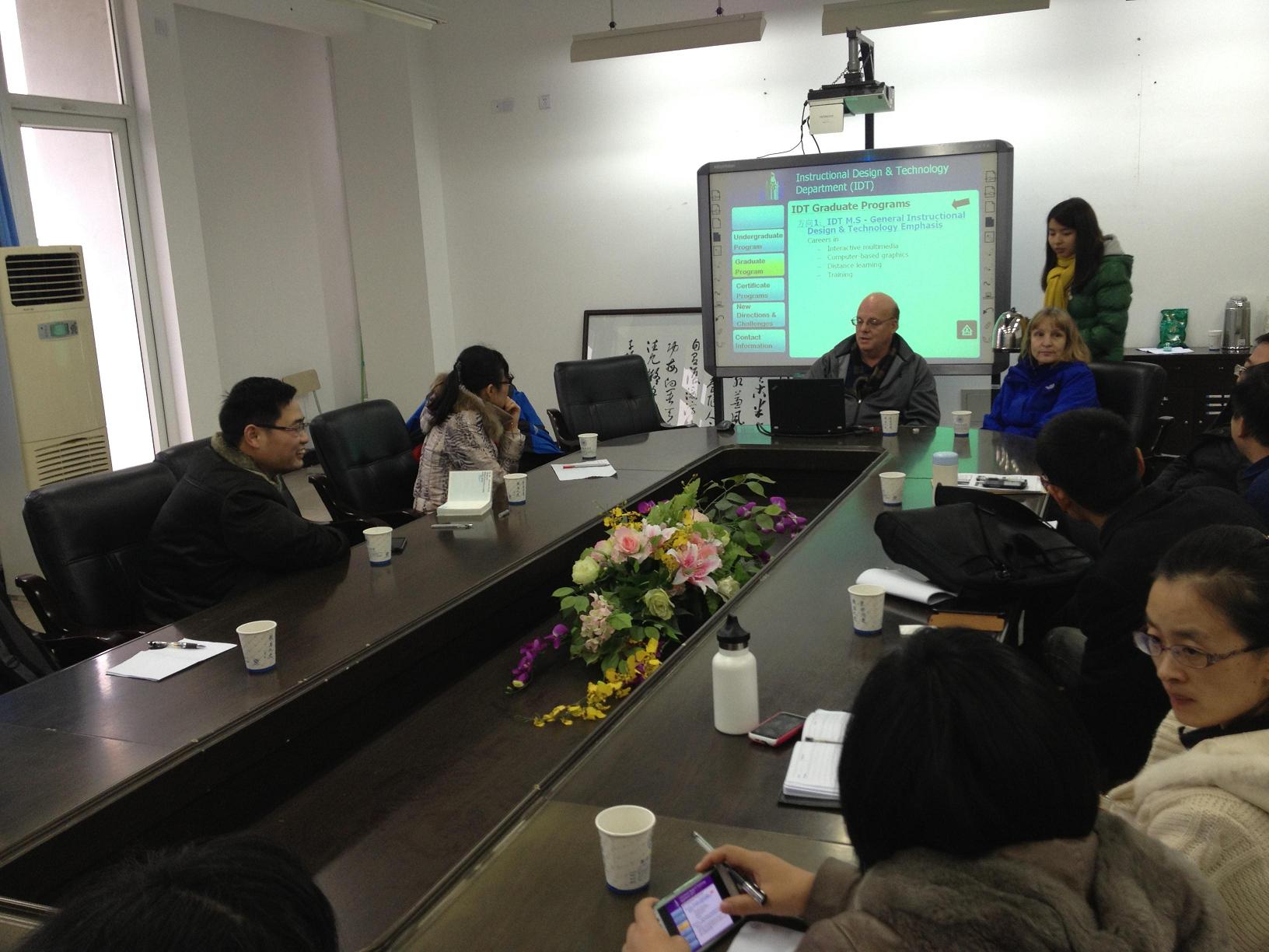 领导彭小明副院长与研究所的全体教师、部分研究生和本科生参与了本次交流活动。在这次活动中邀请了美国西伊利诺斯大学(Western Illinios University )教育技术系主任怀特( Hoyet Hemphill )博士和琳安达( Leaunda Hemphill )博士。在活动中,Hoyet H. Hemphill博士做了题为“An U.S. Program in Instructional Design & Technology: Preparing the Instructional Designers & Educational Technologists of Tomorrow”(《美国教学设计与技术专业:教学设计师培养的现状及展望》),并与本研究所教师就“研究生与本科生的培养机制、技术如何提高学生的学习能力、学生实践工作”等内容进行了深入的学术对话与交流。