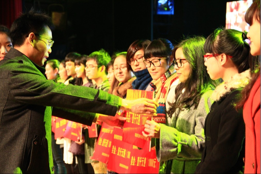 元旦微博墙不断留言、刷屏,期望高频率的留言可以增加获奖的几率。另外,同学们的新年祝愿卡片也充满了抽奖箱。晚会现场通过抽取新年祝愿卡,抽取了五十位观众荣获三等奖,三十位观众荣获二等奖,五位观众荣获一等奖。礼品虽小,但是代表了财神捕鱼