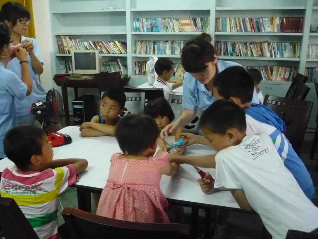 15日上午8点30分,由队员洪高慧负责的“手工艺术——学做牡丹花”课程准时开始。为了更好的调动课堂气氛,保证孩子们的安全,课堂上孩子们被分为若干小组,每个小组再分别派一名实践队队员与之协作。在高老师的引导下与各位小组老师的帮助下,孩子们分工制作完成了精美的牡丹花。为了进一步巩固所学,加深印象,各个小组又独立完成了牡丹花的制作。在巧手下绽放的牡丹花展示着队员与孩子们共同学习所获得的快乐。