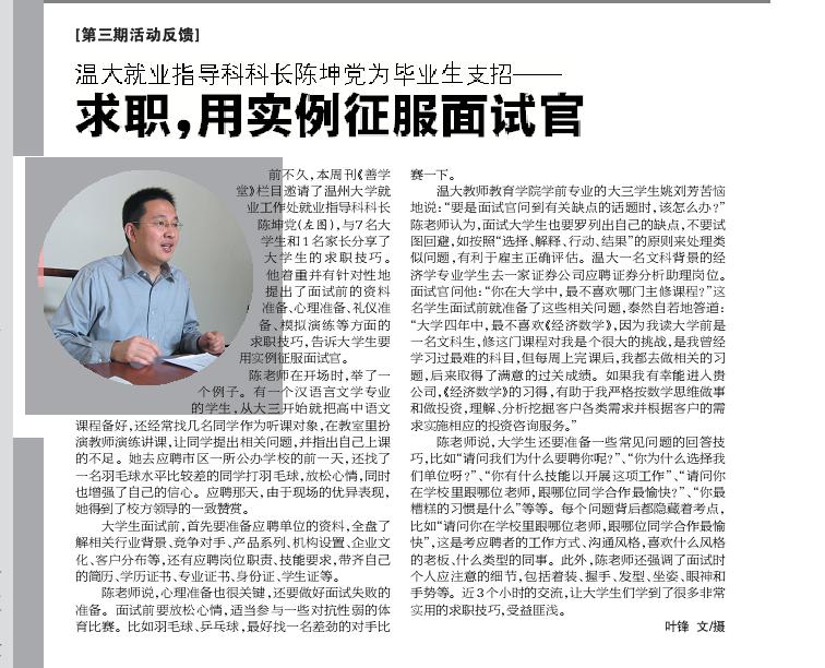 老师还强调了面试时个人应注意的细节,包括着装、握手、发型、坐姿、眼神和手势等。近3个小时的交流,让大学生们学到了很多非常实用的求职技巧,受益匪浅。 叶锋 文/摄