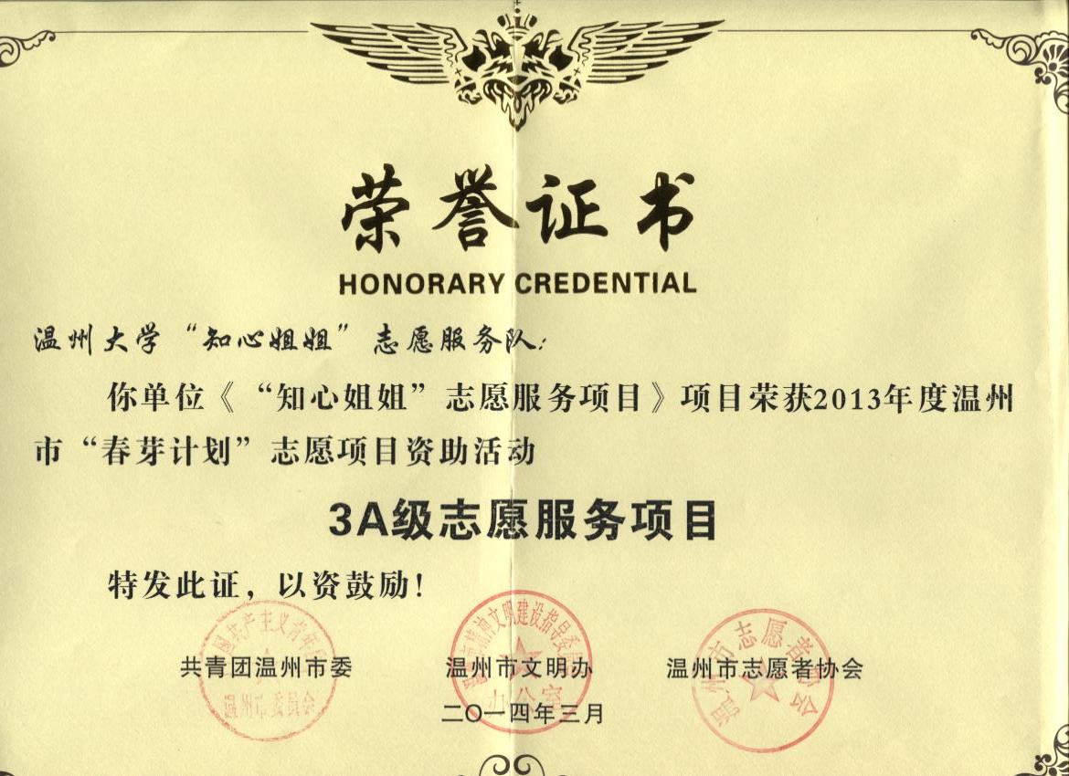“知心姐姐”荣获2013年团市委春芽计划3A 级项目及2013年温州市志愿服务创新项目奖荣誉两项殊荣。