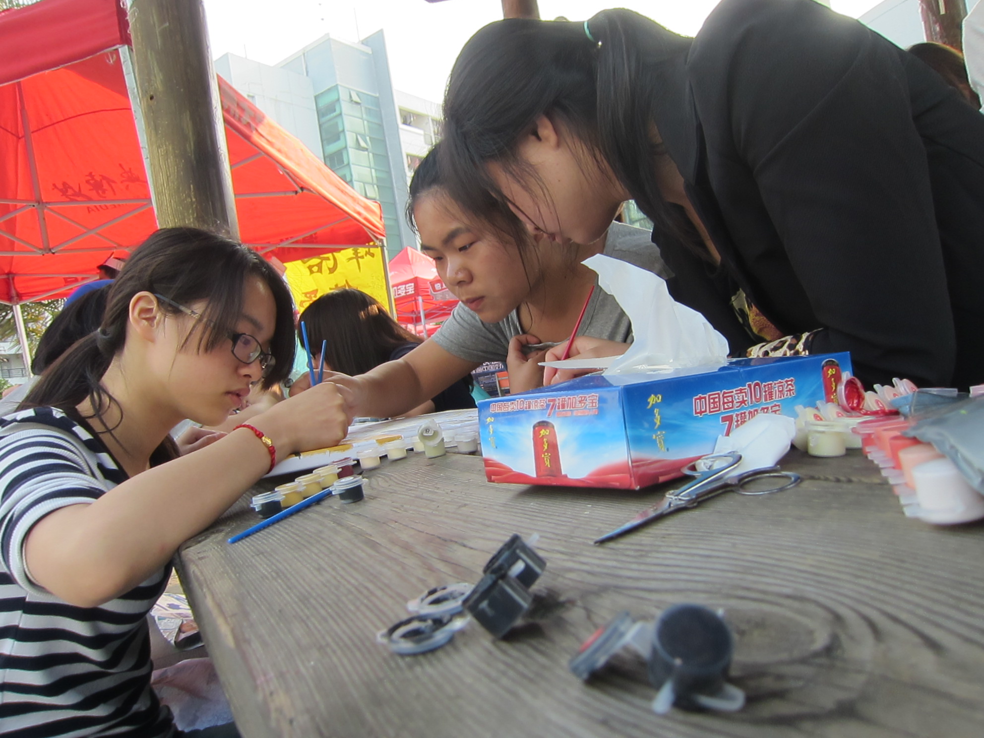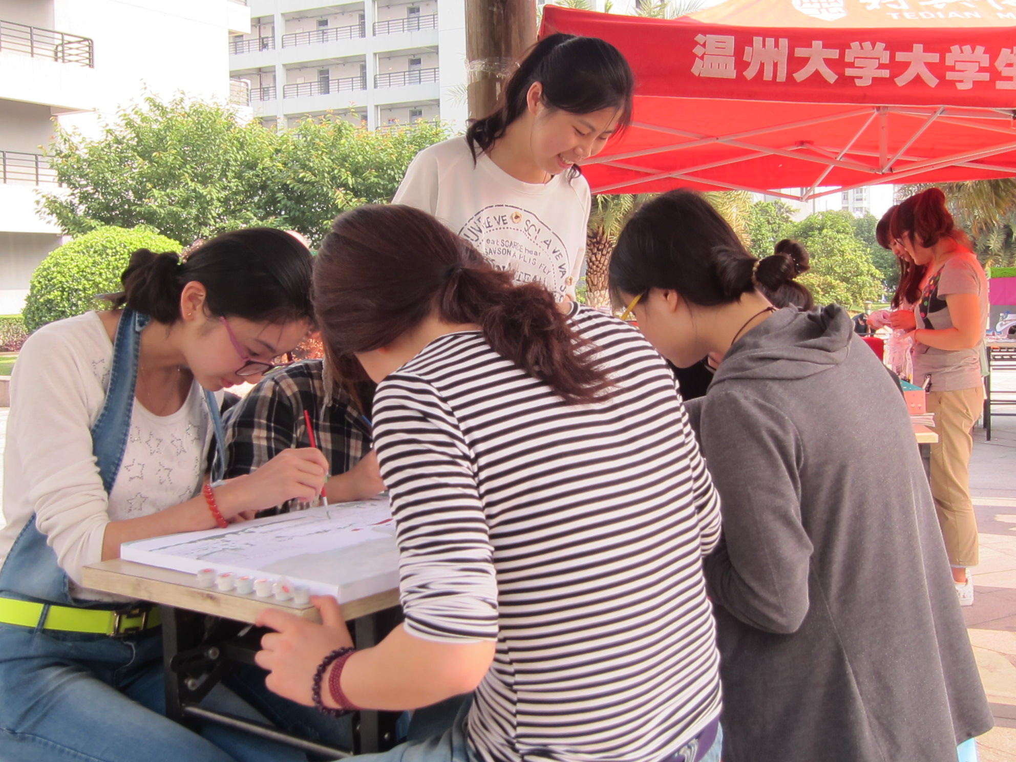 支部精选了三幅最具代表性的温大风景照片,并联系到了网上自制“填充油画”的商家,进行了油画的制作和购买,真诚邀请溯初学区的学子与我们共同绘画校园美景。尽管当天气温较高,但是这并没有打击到大家对“填充油画”的浓厚兴趣和对温大校庆的祝福热情。只见,那五彩缤纷的“颜色”不断地在来回穿梭,而在铺开的图纸之上,温大最美丽的色彩也逐渐浮现。