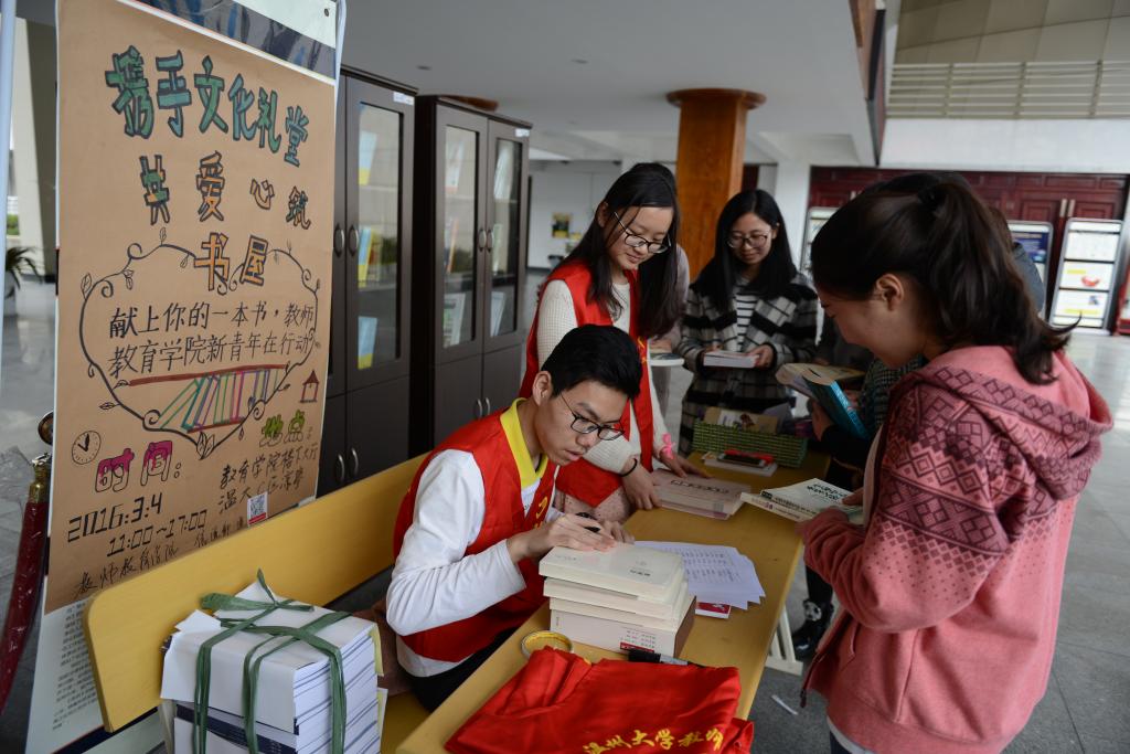教学区和学生生活区分别设点募捐书籍的活动,并将于近日把捐赠的书籍送到乐清市虹桥镇各文化礼堂,用师生的温情和书籍的智慧为虹桥文化礼堂添一份色彩,丰富礼堂文化建设。短短一个下午时间,共收到了师生捐赠书籍500余册。