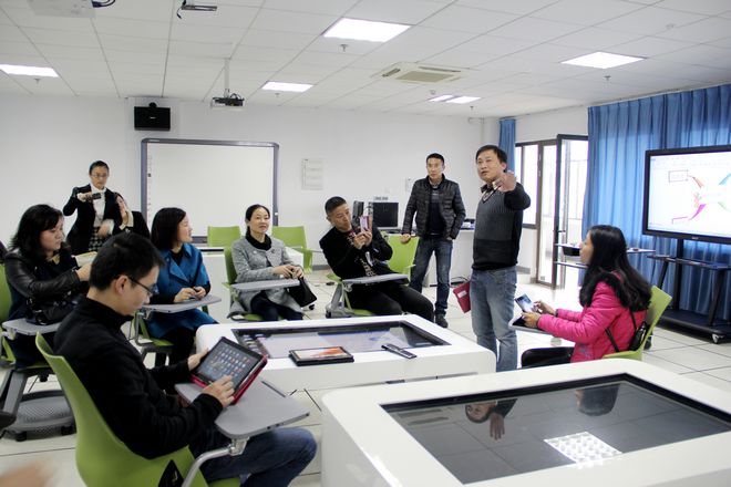 老师们重点参观了信息化教学设计实验室、通用技术实验室、机器人实验室、未来教室、动漫实验室和数字化微格实验室,他们被未来教室先进的教育理念和优良的设备所吸引,产生了浓厚的兴趣。叶新东主任向老师们详细介绍了未来教室的构建思路、使用方法和未来设想。未来教室具有多屏学习空间、自由的位置空间组合、良好的信息输入、输出、交互和呈现环境以及便捷的资源支持环境,为有效解决当前教学中存在的教学内容呈现问题、小组合作学习中的交流展示问题、虚拟与现实课堂的互动问题提供了良好的思路。