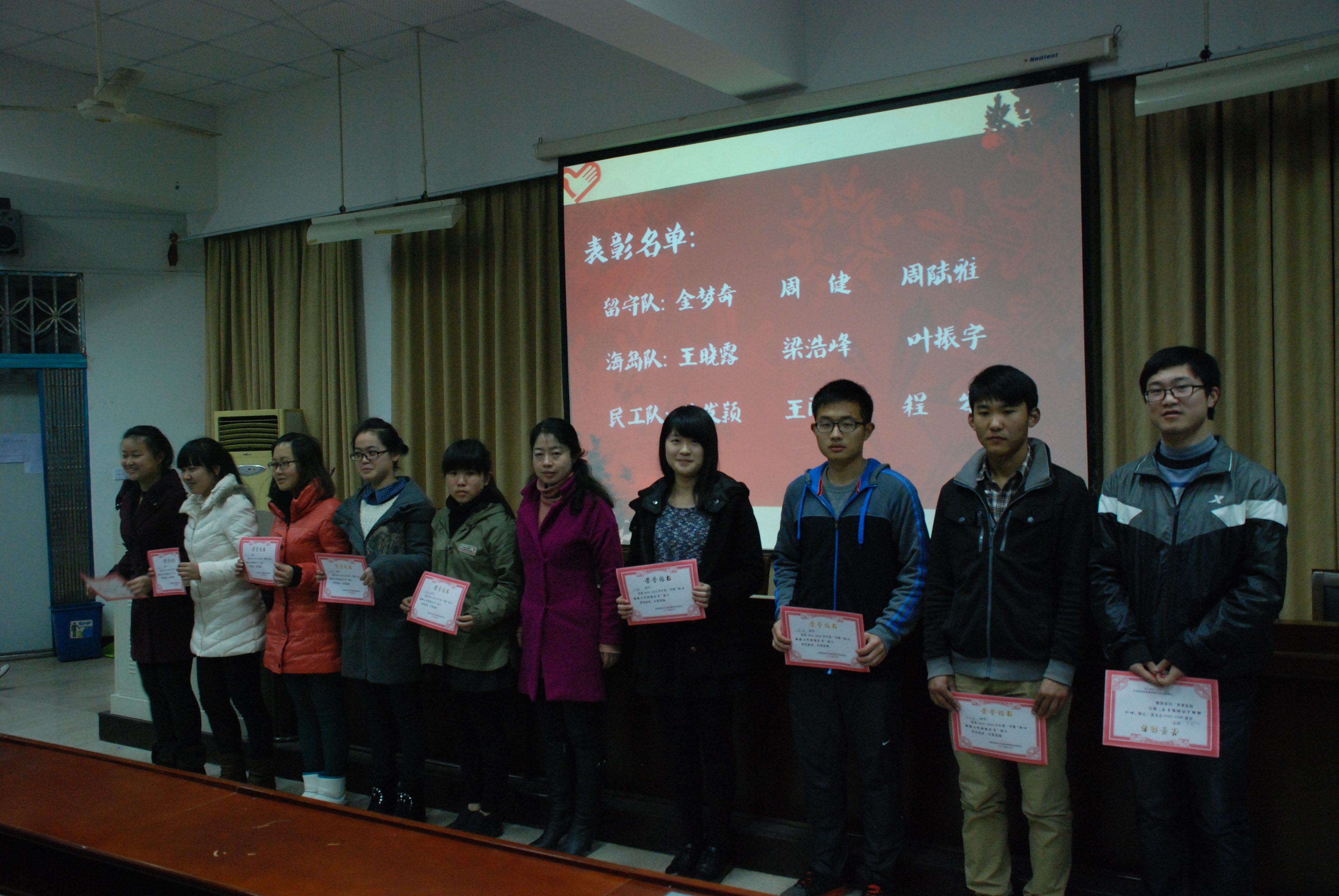 参加第十二届中国(温州)合唱节接待服务工作的50名志愿者、上学期“知心姐姐”工作积极分子和在“知心姐姐”师范技能大赛的获奖者们颁发奖状,并合影留念。