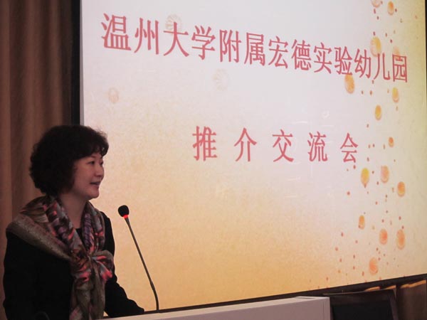 宏德幼儿园陈娴园长详细介绍了幼儿园情况,她以生动的PPT展示了幼儿园的办学历程、办学思想、办园目标、课程目标以及幼儿园的办学特色,其中“语言工作室”“艺术工作室”“健康工作室”等办学特色赢得了社会的广泛关注与好评。