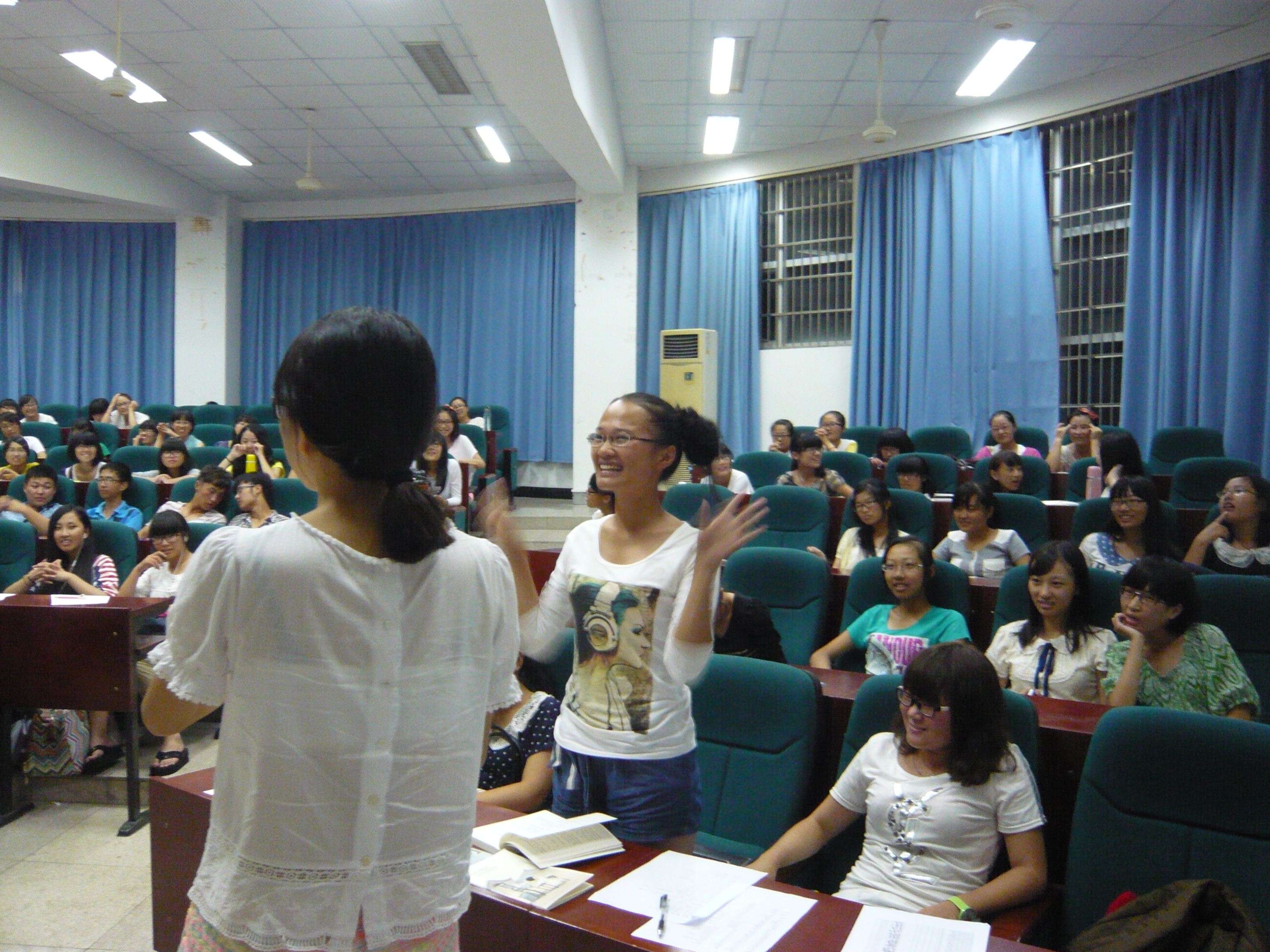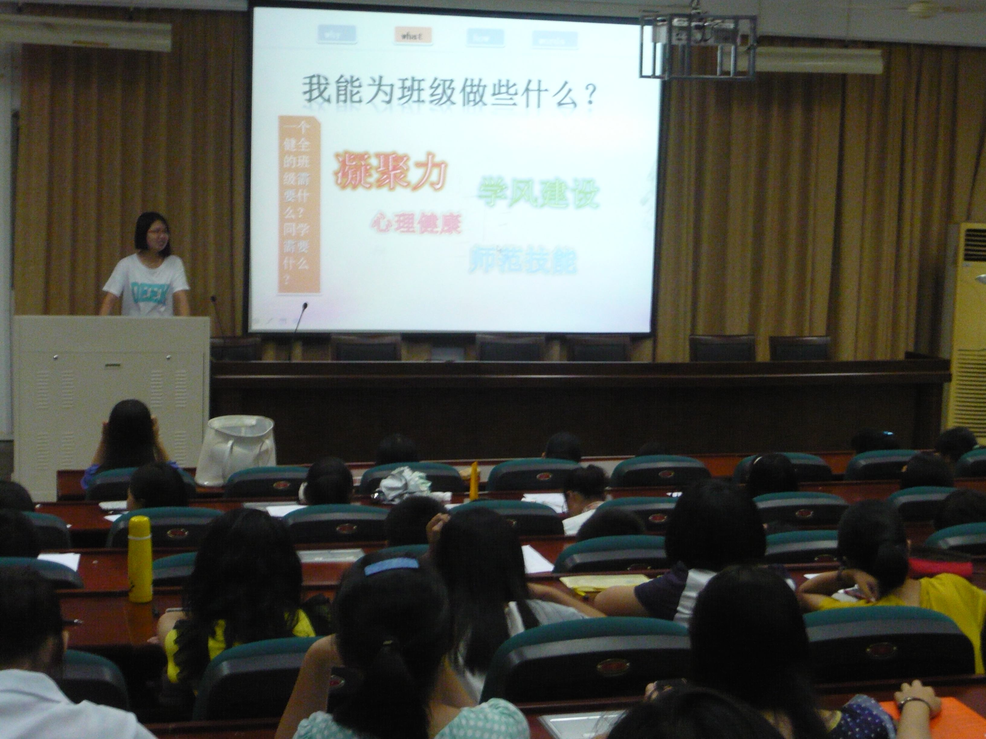 的各类评比中屡获佳绩,为学弟学妹们树立了优秀的榜样。陈汀学姐则是分享了个人多年的学习经验。她以一个“吃鸭”的游戏和秀才的三个梦指明了大学新生们要“摆正心态”。其次,要有方向,无论是学习、生活、娱乐、工作上都要给自己制定明确而具体的目标,才不至于荒废大学四年。有了目标之后,要开始做规划。在小教专业学习、学习上的考级考证计划、学习方法、学习资源各方面要逐步细化目标,做好有可行性的计划。