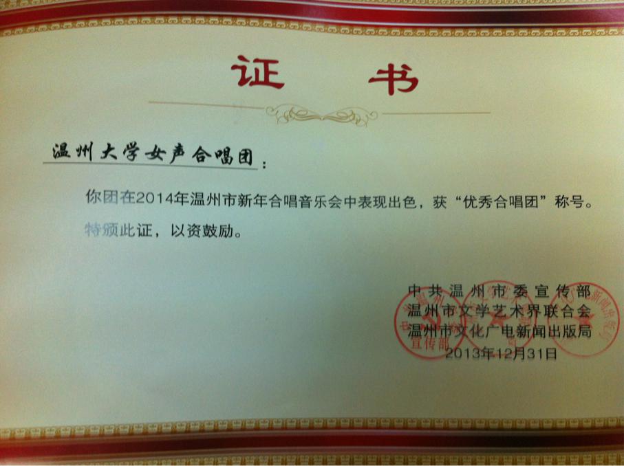 女声合唱团作为第十二届中国合唱节银奖团队在新年合唱音乐会上深情演绎了《李有松》、《走进美丽,走进神奇》两首歌曲,并荣获“优秀合唱团”称号。