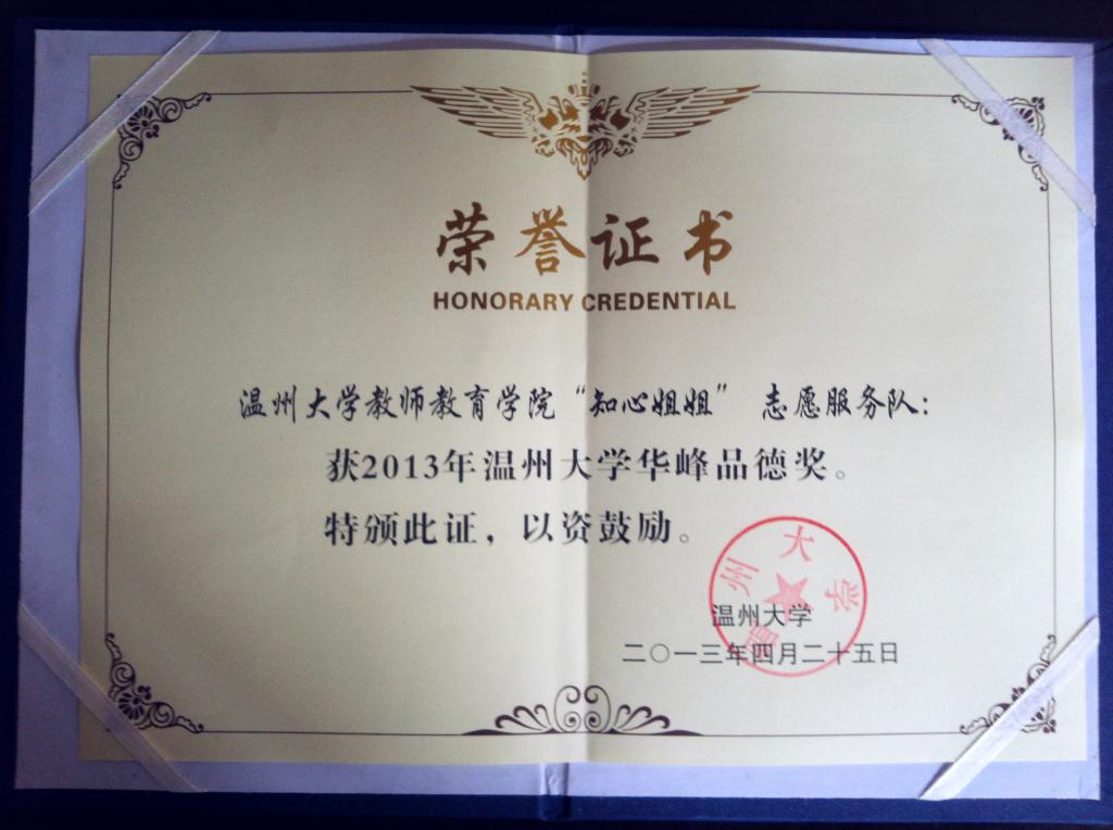 先进基层党组织荣誉。 2012年2月,知心姐姐荣获温州春芽计划资助 2012年11月,知心姐姐荣获浙江省“示范青少年服务台基层工作站”称号。
