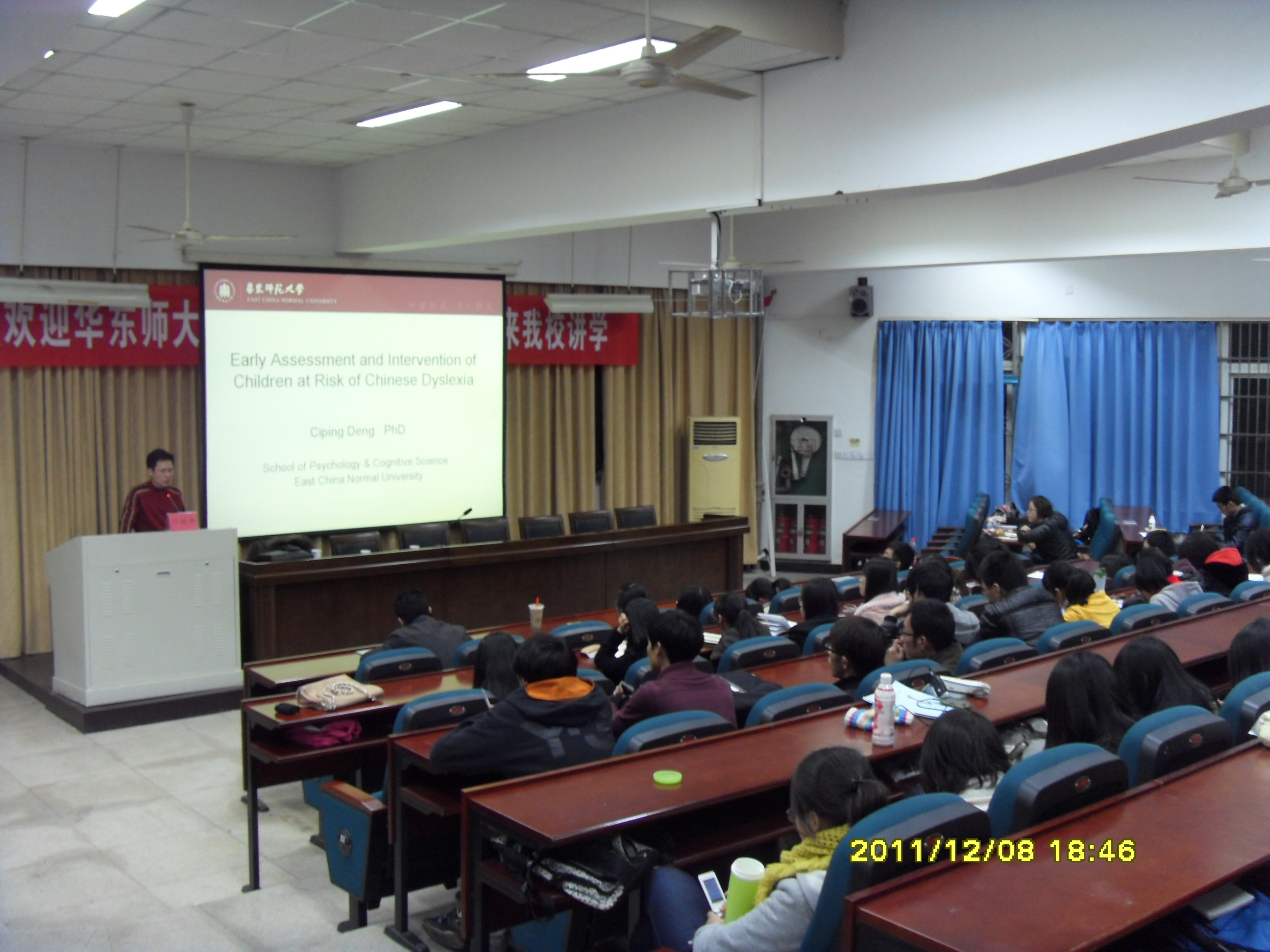 讲座开始,邓赐平教授首先做了《Early Assessment and Intervention of Children at Risk of Chinese Dyslexia》的学术报告,在报告中邓教授从语言和认知层面对儿童的阅读障碍进行了深入分析,并从这两个层面提出了评估策略。之后,邓教授也提出了“最科学的才是最道德的”这一观点并进行了具体阐释。报告结束,同学们积极踊跃的对相关问题提问并得到邓教授的解答指导。接下来讲学的是从事实验心理学研究30多年的乐竟泓教授,乐教授语言幽默风趣,形象生动,把晦涩难懂的心理学问题巧妙生动的予以解释,激发了同学们强烈的求知欲。同时,他也对心理学这么学科进行了全新的诠释并表达了自己的挚爱之情。最后,乐教授也对同学们学习心理学提出了要求,他说学生在校期间不应急功近利,要学好基础知识,打好进行心理学研究的基础。