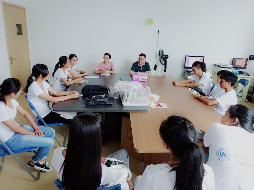 老师们热情地和每位同学打招呼,还给我们带了饮料、糕点、水果等慰问品。在短暂的寒暄过后,我们一行人到办公室进行交流。我们和院长围桌而坐,大家向老师们汇报了一周的活动情况,分享了自己的心得。