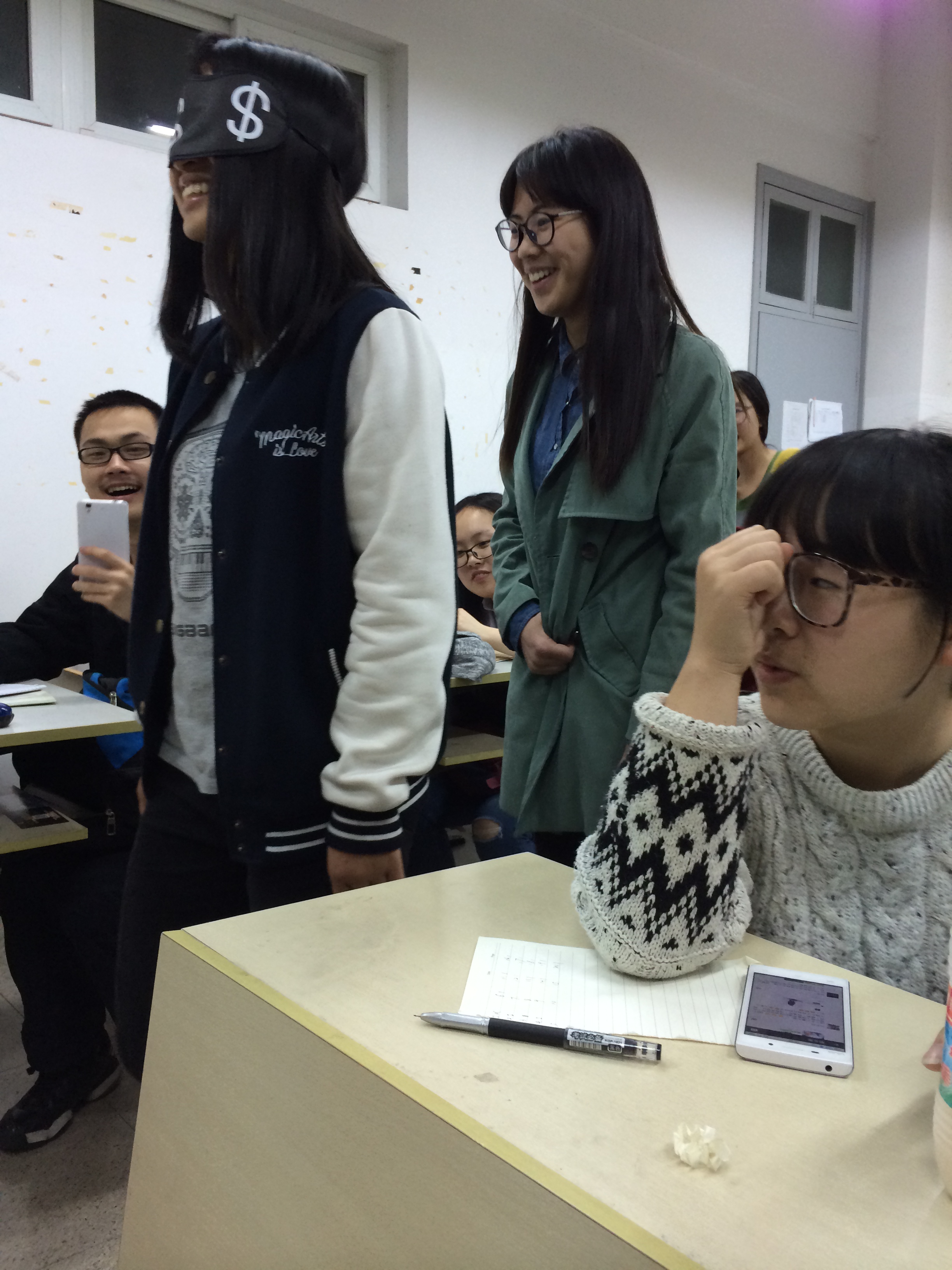 第一个是“鬼屋游戏”。每一组挑战者需要由两位成员组成,一位扮演寻宝人,但必须戴眼罩,另一位充当“眼睛”,只能用有声语言指导寻宝人逾越重重障碍来寻找主持人放置的“宝物”。游戏规定,挑战者不能碰到障碍物,否则,就算失败。两位合作者都需要小心翼翼,指导者耐心地“发令”,寻宝者相应地不断调整动作幅度和行走方向。寻宝者担心撞到什么而个个缓慢地移动着脚步。寻宝者即将碰上桌椅了!指挥者大声地喊叫:“哎哎、别别、慢一点!”随着不断的磨合,指挥者越发自信,寻宝者越发信任合作越来越默契,最终顺利地找到了“宝物”。在游戏中,同学们体会到了合作和信任的力量。在交际中,我们应当学会信任对方和使对方信任。