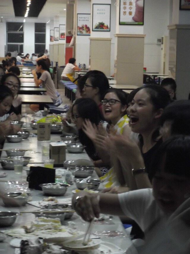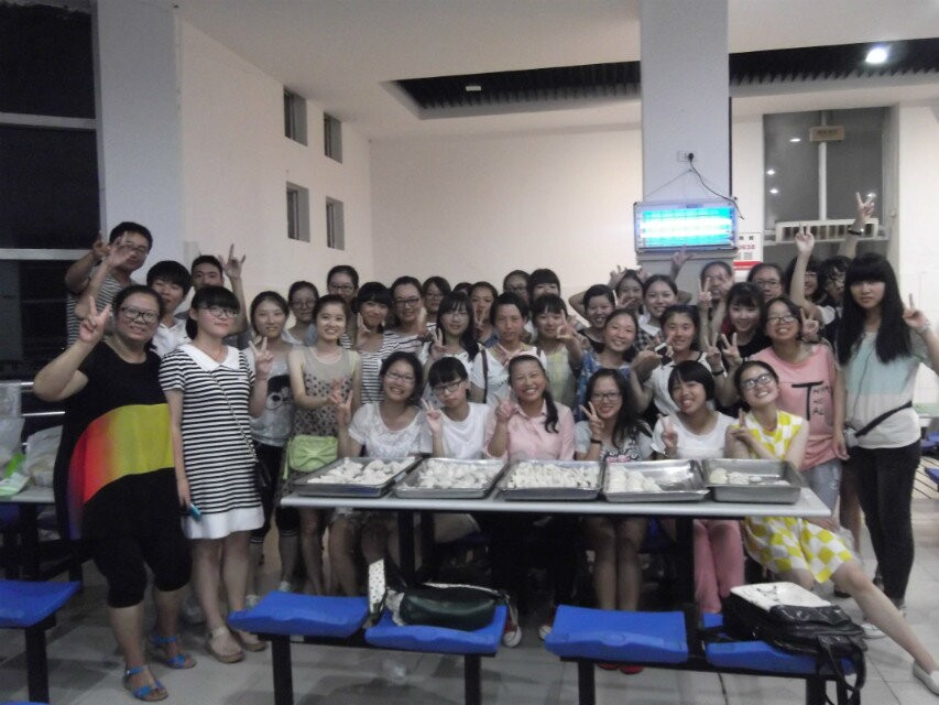 第二项活动是班委精心准备的包饺子比赛。全体同学自由结合,分成六个小组来包饺子。饺子皮和馅事先已经请食堂工作人员帮忙准备,同学们要做的就是DIY各具特色的饺子。女生们尤其活跃,纷纷包出了兔子形、元宝形、枣子馅等别致、喜庆的各色饺子。男生在班主任的提议下作为评委,评出了优胜的三个小组。最后食堂师傅帮忙煮好了饺子,班主任亲自掌勺,一人一碗,大家迅速地将数百个“战斗成果”消灭掉。之后,同学们在班委的组织下进行了竞猜和赛歌活动。