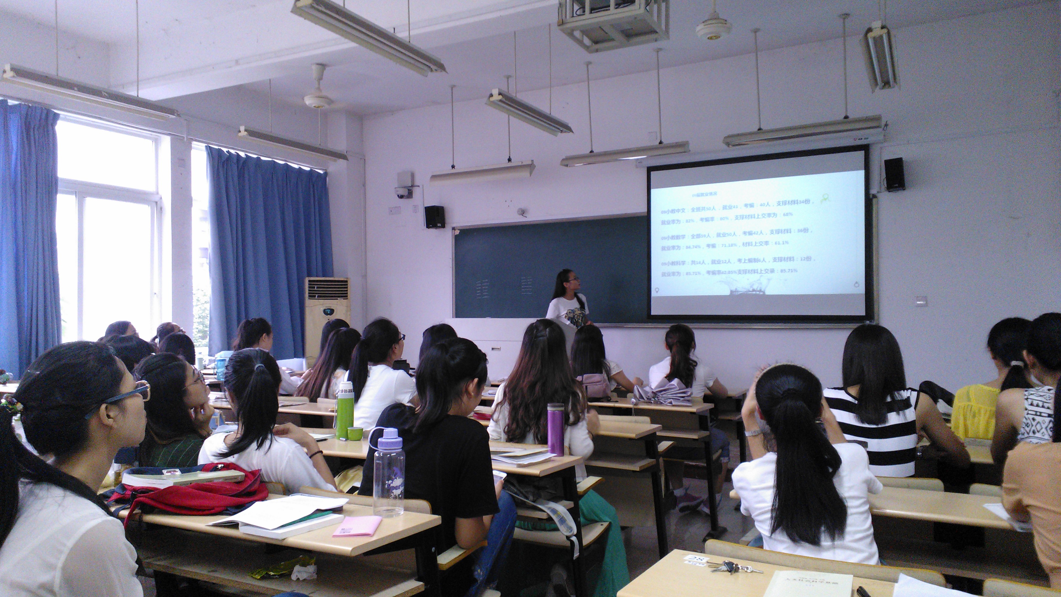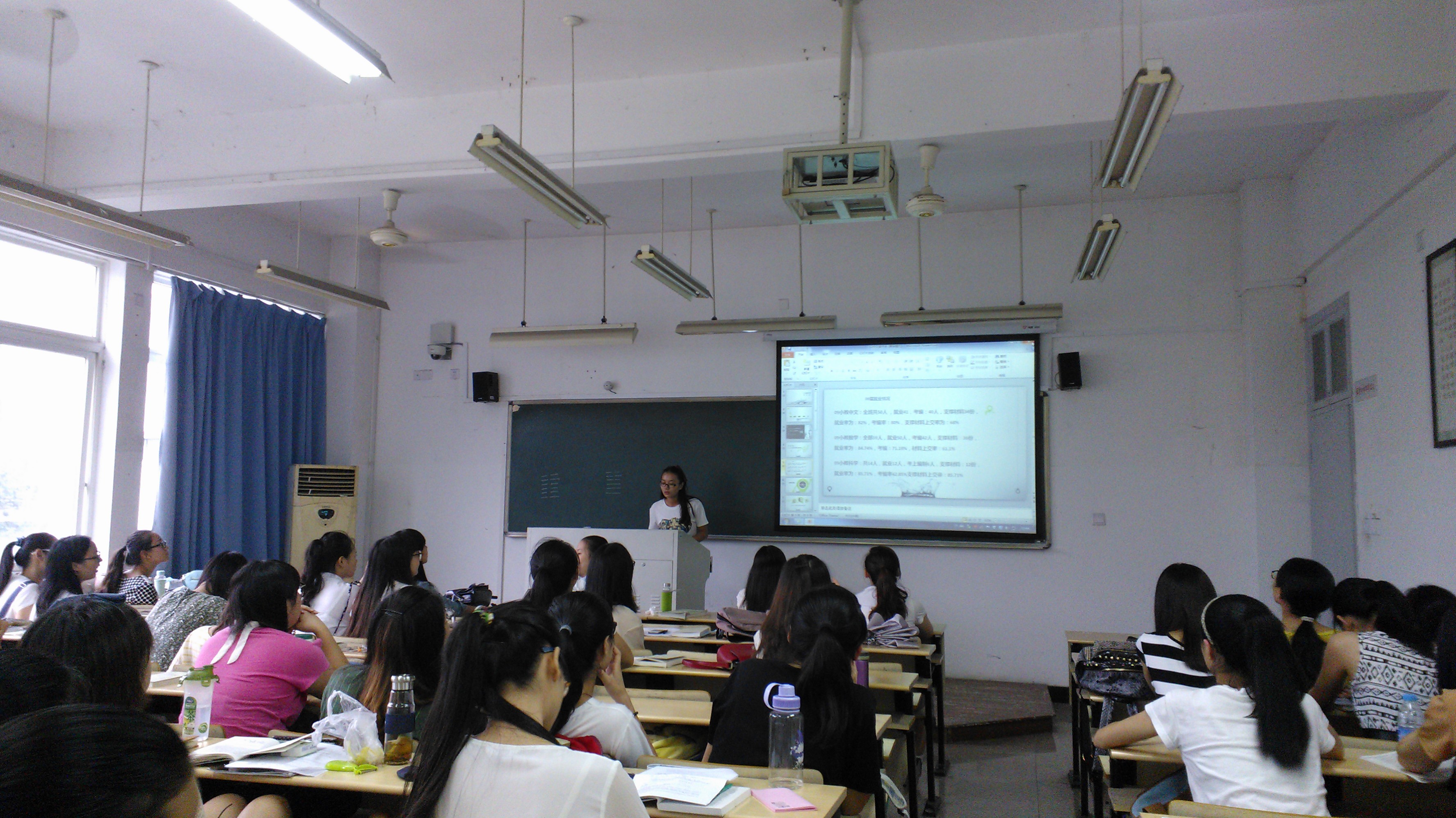 首先,王萍介绍了09届和10届小教中文班学长学姐们的考编情况。通过幻灯片及讲解,大家得知09小教中文班全班共50人 ,考编40人,就业率为82%,考编率为80%。今年,10小教中文班不甘示弱,再创佳绩,考编率高达约91%。听罢此事,身为小教中文班的一员,同学们不禁感到自豪,却也感到巨大的压力,为自己的将来隐隐担忧。