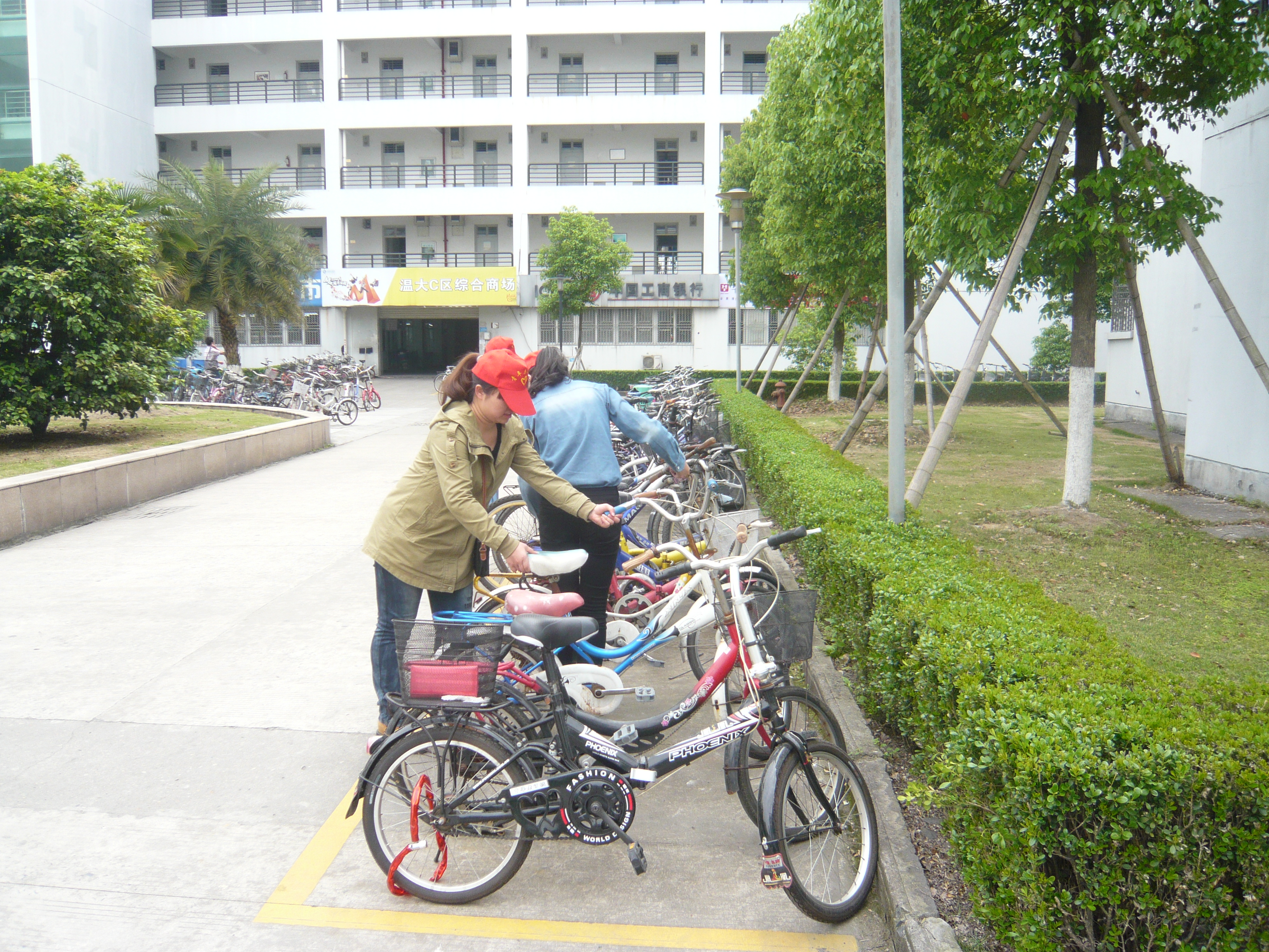 下午2点,活动准时展开。我们相约凉亭,在实践组长的讲解下,志愿者们以三人为一组,分配好各自的任务就开始了。溯初学区停车的场地还是比较多的,但是由于管理人员有限,就出现了自行车摆放不正确的情况。许多自行车停在了黄线外,这破坏了原本的和谐,我们的志愿者们马上进行了纠正。学区的卫生情况还是做得很好的,我们志愿者走了很多地方也没看到什么垃圾,这让我们感到骄傲。