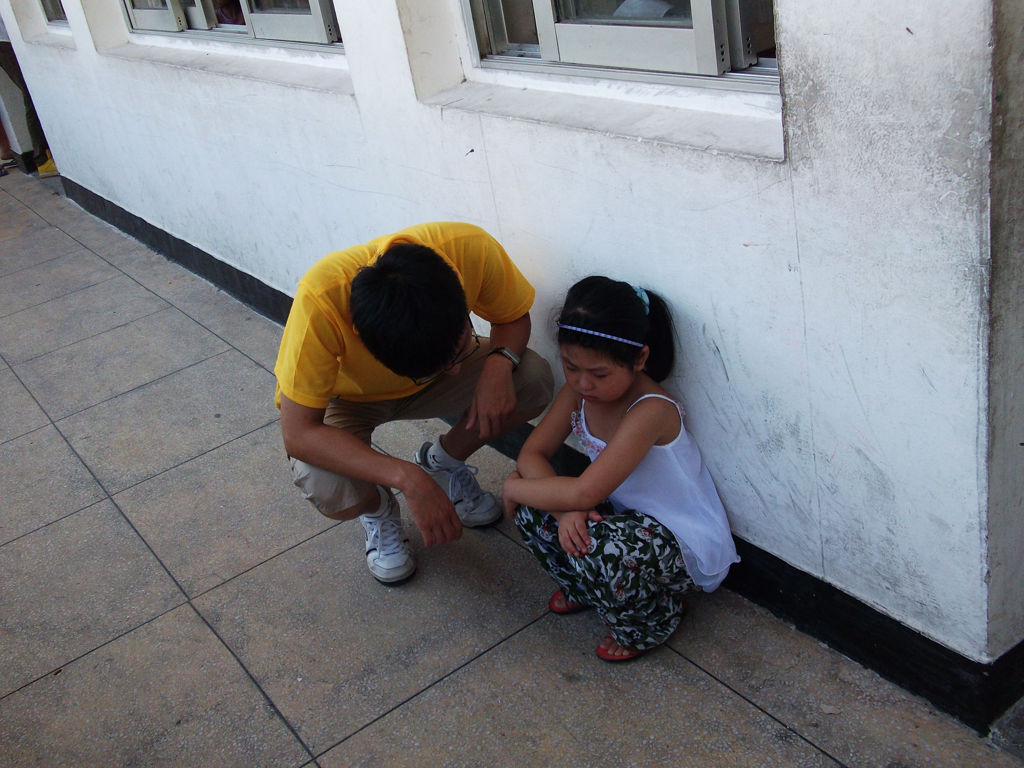 第一次见到她,是在7月2日那天上午。当所有的孩子都开开心心地走进校园,找到自己的班级,坐在座位上兴奋地东张西望时,她却“赖”在“快乐提高班”教室门口,死拽着舅妈的胳膊不放。泪珠大颗大颗地从眼眶里滚落,小嘴紧紧抿着,无论身边的舅妈、我们的队员如何劝她,她都不要走进这个班级,参加这次的夏令营。舅妈走后,我们努力地与她沟通交谈,她却一概不予回应,完全将自己封闭在个人的世界里。面对这样一个对我们的夏令营如此“顽强”抗拒的学生,所有人都有点儿不知所措。