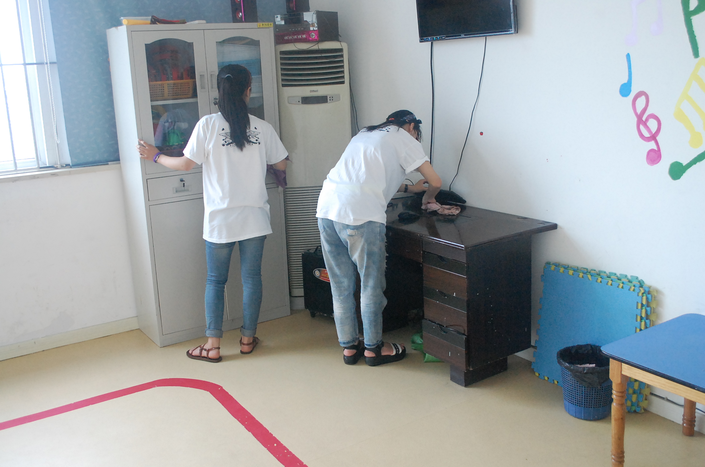 2014年7月3日,今天是心翼实践队在幸福驿站实践的第二天。有了昨天的经验,队员们对实践内容不再陌生。一到实践地,队员们就主动陪伴在孩子的身边,与孩子们一起玩耍,一起利用统感室的器械做康复训练。无论是上午的队员还是下午的队员,他们都紧紧跟在孩子们的身后,担心他们因平衡性不高而摔倒,引导他们将注意力集中在老师和眼前的训练道具上。虽然小朋友们今天学习的内容与昨天一样,但是队员们仍然耐心地陪在孩子们的身边,专注于他们的一次次重复,与家长共同期待他们的一点点进步。