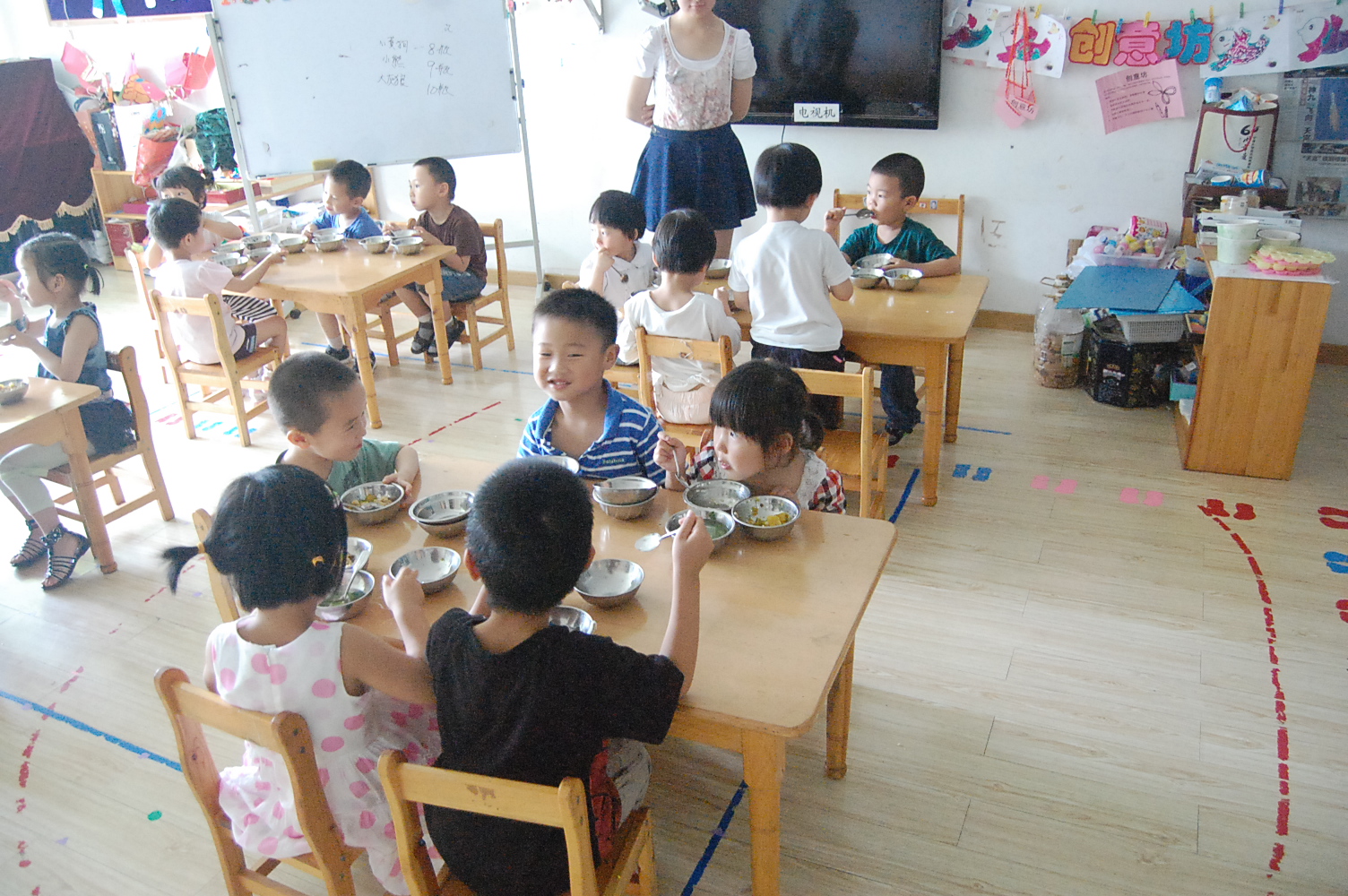 中午,我们有一个多小时的休息时间,队友们趁着这个机会,一个个都十分高兴地去教室帮助老师管理小朋友们的午餐饮食,给孩子们讲故事,帮他们脱衣服睡午觉等。看着一个个孩子活泼的笑脸,我们仿佛看到了自己的小时候。