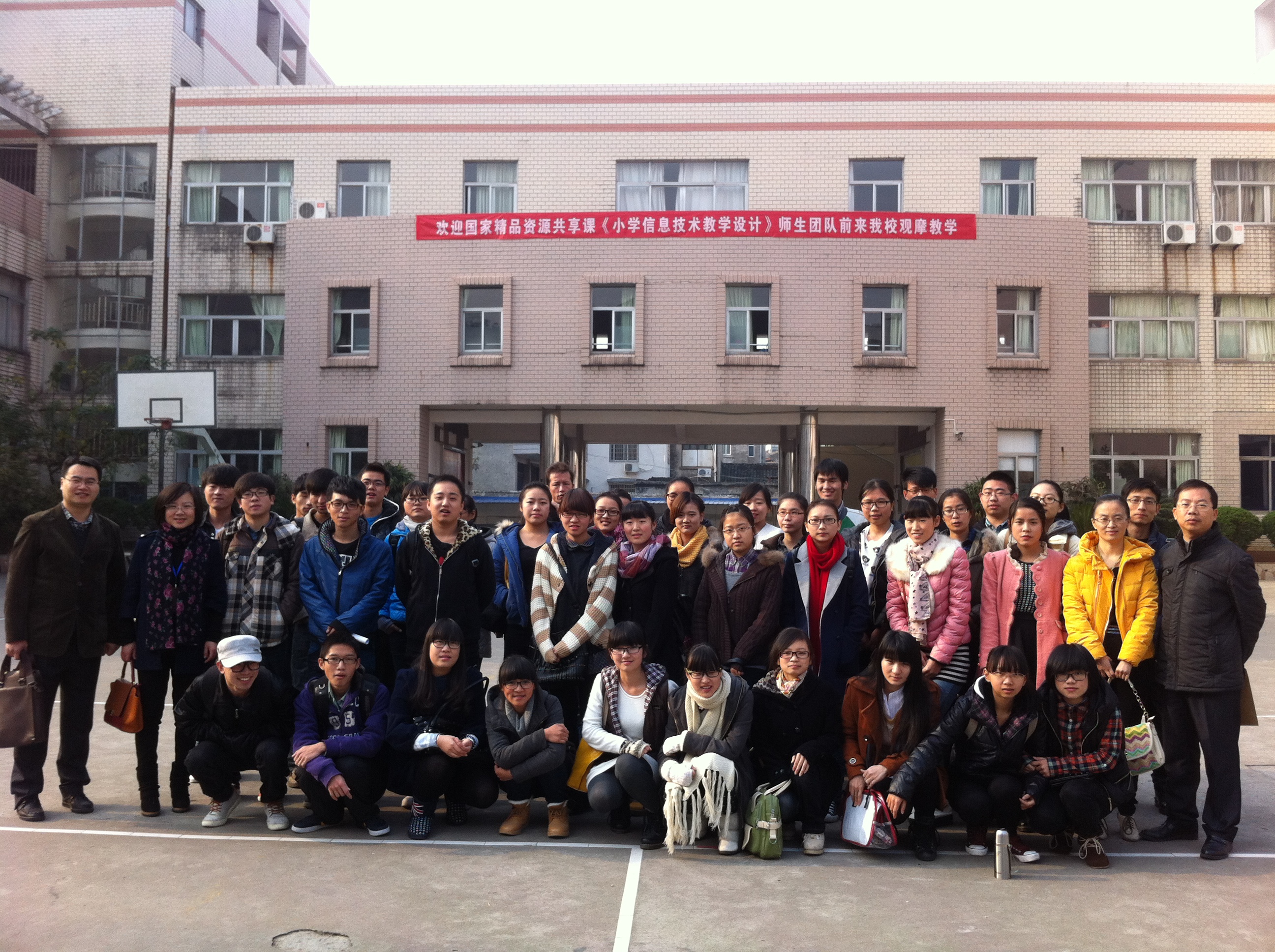 一个小时后,全体师生安全到达昆阳二小门口。谢贤晓老师早已等候在校门口迎接大家的到来。一进校门,所有人就看到主教学楼上高高挂着的横幅——“欢迎国家精品资源共享课《小学信息技术教学设计》师生团队前来财神捕鱼