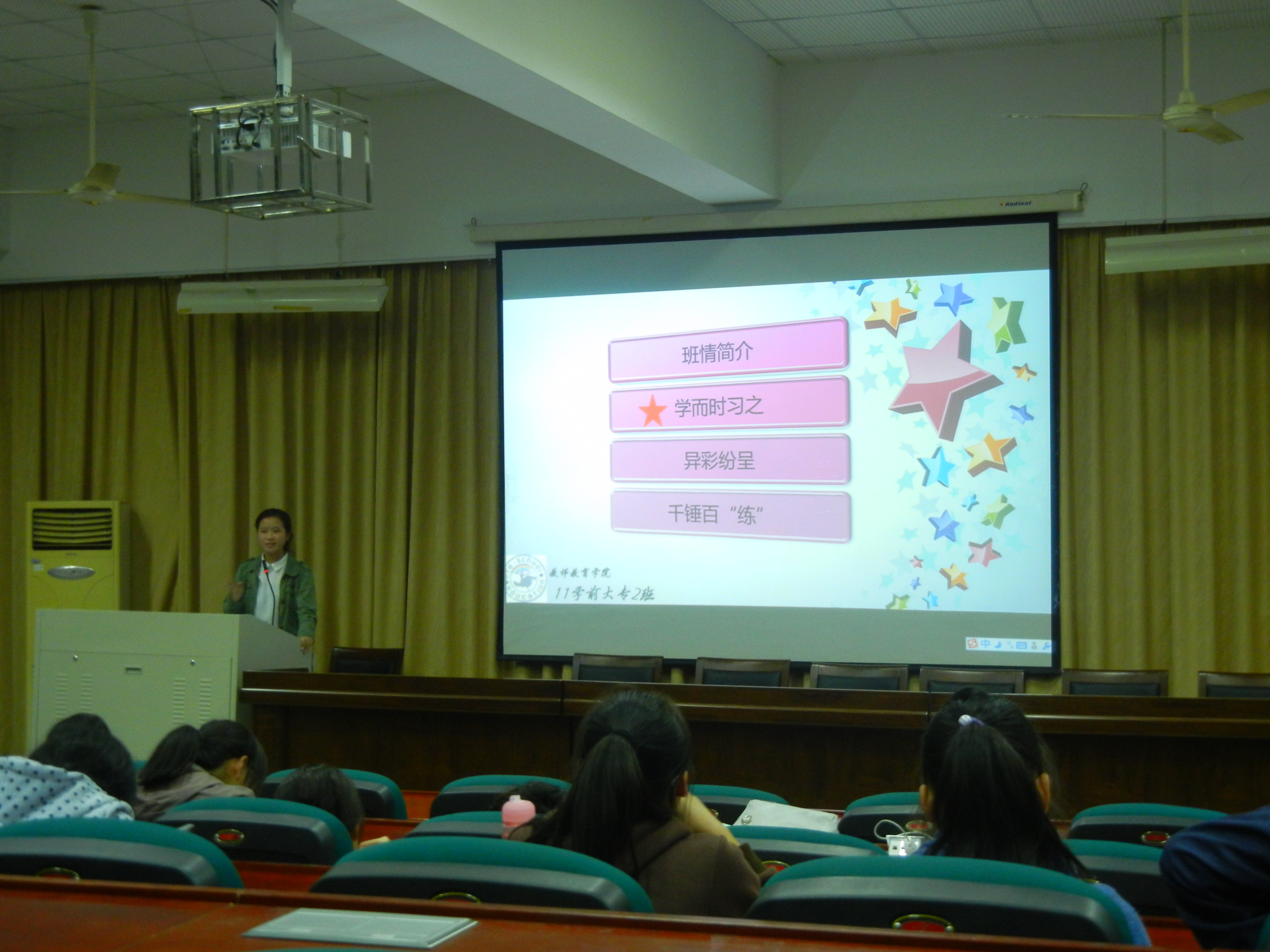 优良学风班的评选主要以班级代表讲解根据各班自身情况所制作的PPT为主要内容,加以场下学生评委的提问作答为评选标准。本次参加的八个班级都很优秀,有关优良学风的一些成绩都让人侧目。而其中11大专(2)班所展现的优良学风更是让我们记忆深刻。